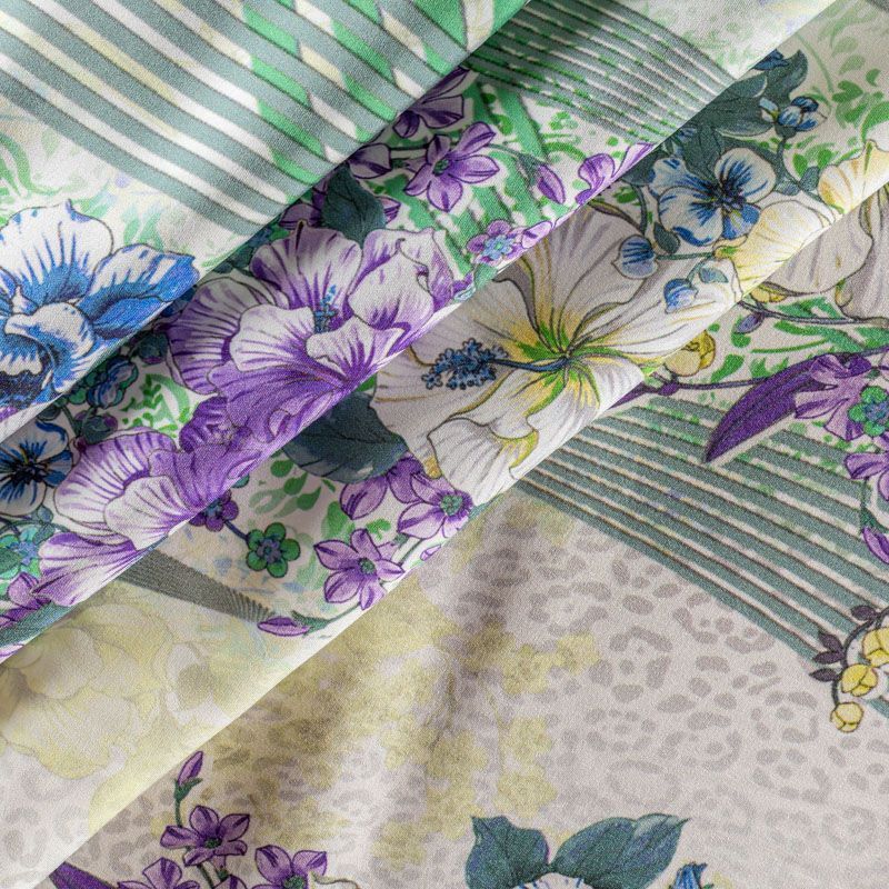 Итальянский матовый шелк с насыщенным по составу принтом: сочетание геометрических линий, анималистического и растительного рисунка на молочном фоне, тонкий, слегка прозрачный, отлично драпируется, легкий и струящийся с креповой поверхностью. Идеально подойдет для пошива платьев и сарафанов расклешенных моделей, с воланами, летящих юбок, топов, блузки, костюма в пижамном стиле, домашней одежды.