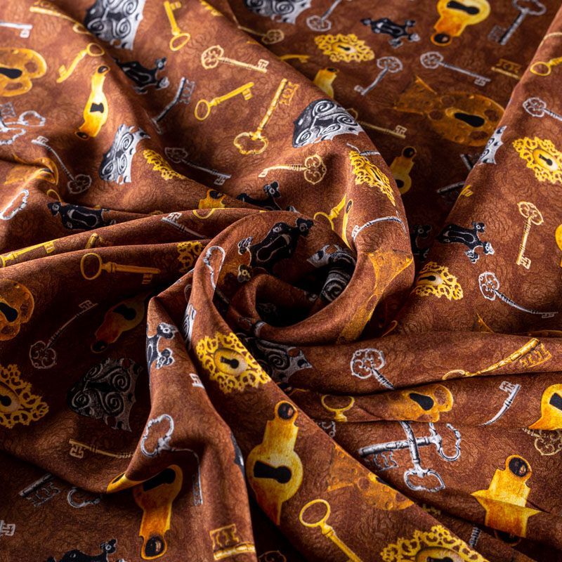 Итальянский матовый шелк коричневого оттенка с узнаваемым принтом от известного бренда. Ткань тонкая, не просвечивается, отлично драпируется, легкая и струящаяся, тянется за счет эластана в составе, лицевая сторона креповая, изнанка - атласная. Идеально подойдет для пошива платьев и сарафанов расклешенных моделей, с воланами, рюшами, летящих юбок, топов, блузки, рубашки, костюма в пижамном стиле.