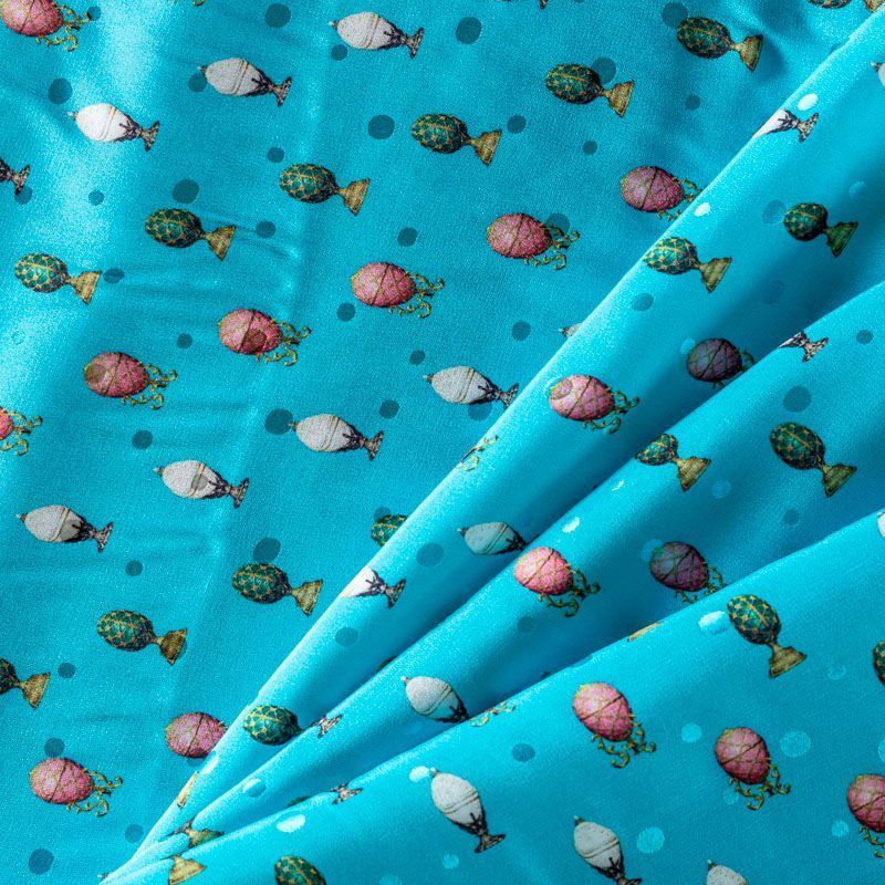 Итальянский шелк с матовой лицевой поверхностью и атласной изнанкой с принтом в виде миниатюр Фаберже на лазурно-голубом фоне, тонкий, не прозрачный, отлично драпируется, легкий и струящийся. Идеально подойдет для пошива платьев и сарафанов расклешенных моделей, с воланами, летящих юбок, топов, блузки, костюма в пижамном стиле.