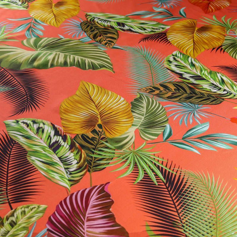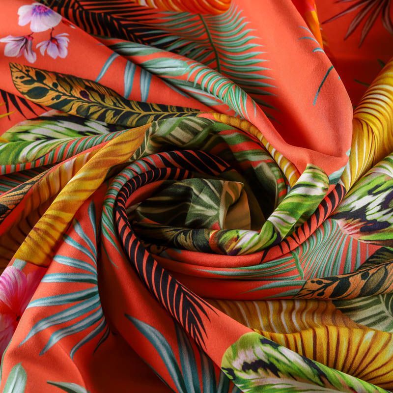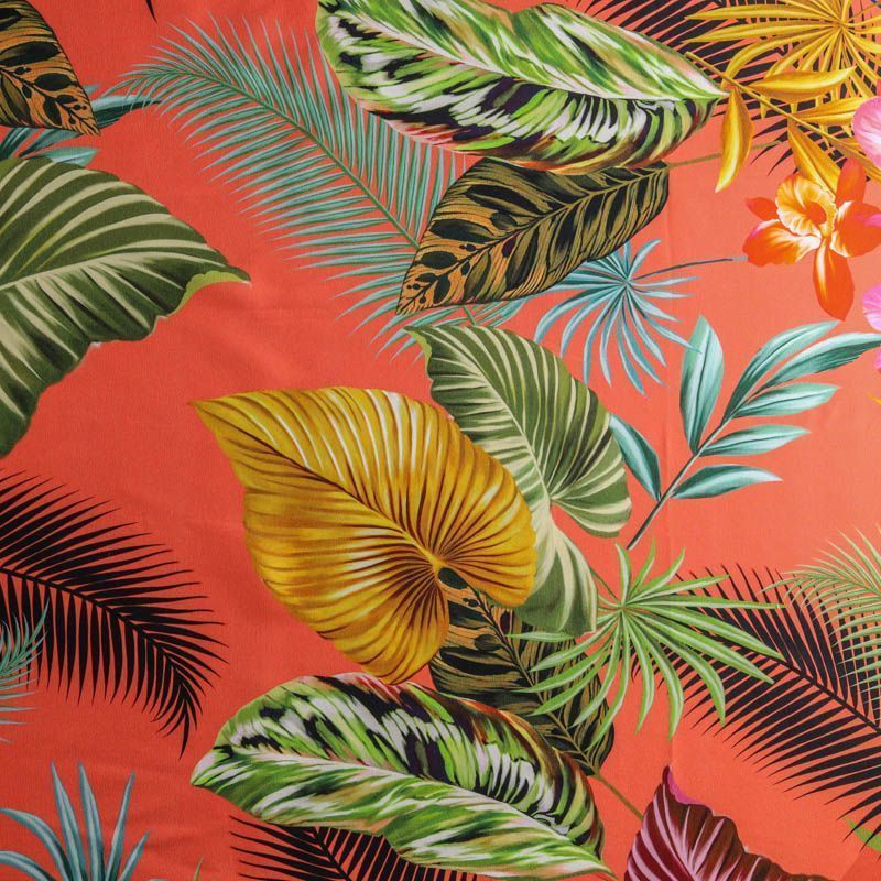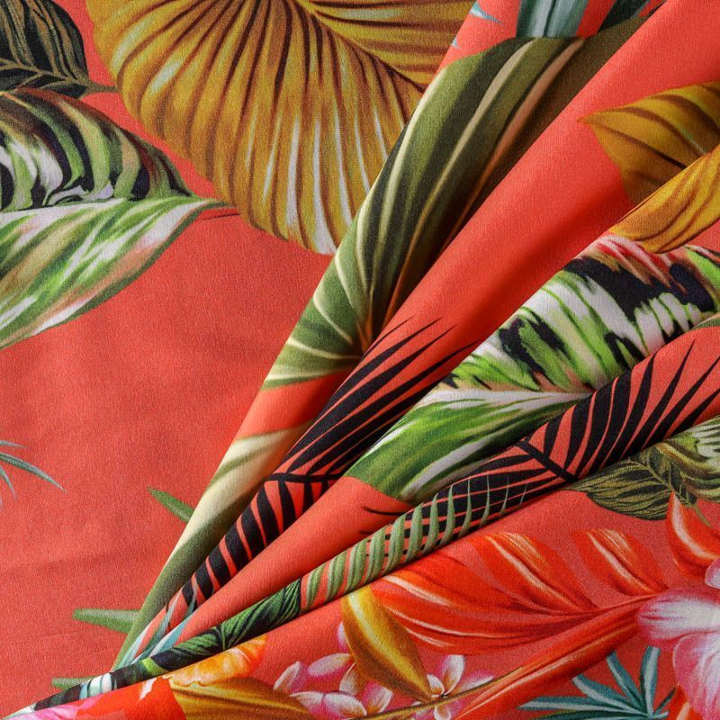 Шелк-купон с ярким тропическим принтом на коралловом фоне. Ткань средней плотности, не просвечивает, струится, хорошо драпируется, в составе присутствует эластан. Поверхность матовая, креповая, изнанка - атласная. Подойдет для платьев, туник, юбок, блузок, топов, костюмов в пижамном стиле, а также для парео, шейных платков.