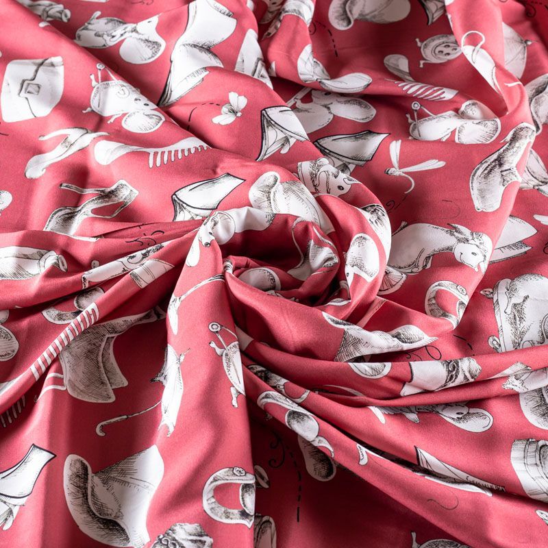 Итальянский матовый шелк кораллового оттенка с узнаваемым игривым принтом от известного бренда. Ткань тонкая, не просвечивается, отлично драпируется, легкая и струящаяся, тянется за счет эластана в составе, лицевая сторона креповая, изнанка - атласная. Идеально подойдет для пошива платьев и сарафанов расклешенных моделей, с воланами, рюшами, летящих юбок, топов, блузки, рубашки, костюма в пижамном стиле.