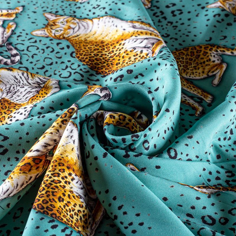 Итальянский матовый шелк бирюзового оттенка с узнаваемым принтом диких кошек от известного бренда. Ткань тонкая, не просвечивается, отлично драпируется, легкая и струящаяся, тянется за счет эластана в составе, лицевая сторона креповая, изнанка - атласная. Идеально подойдет для пошива платьев и сарафанов расклешенных моделей, с воланами, рюшами, летящих юбок, топов, блузки, рубашки, костюма в пижамном стиле.