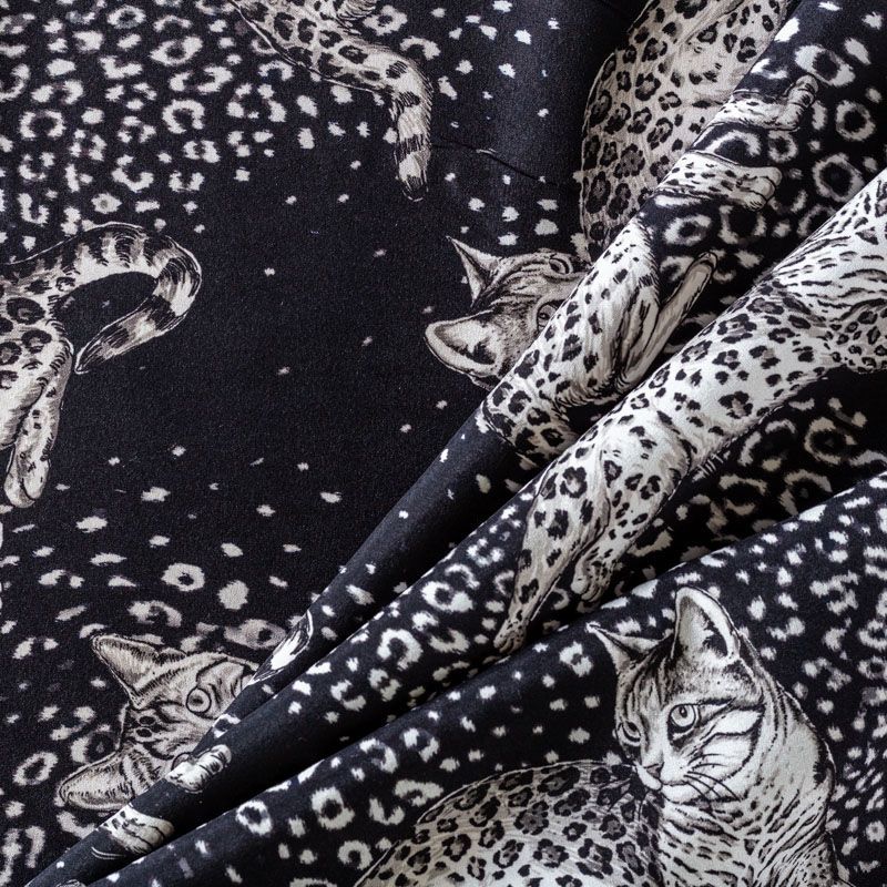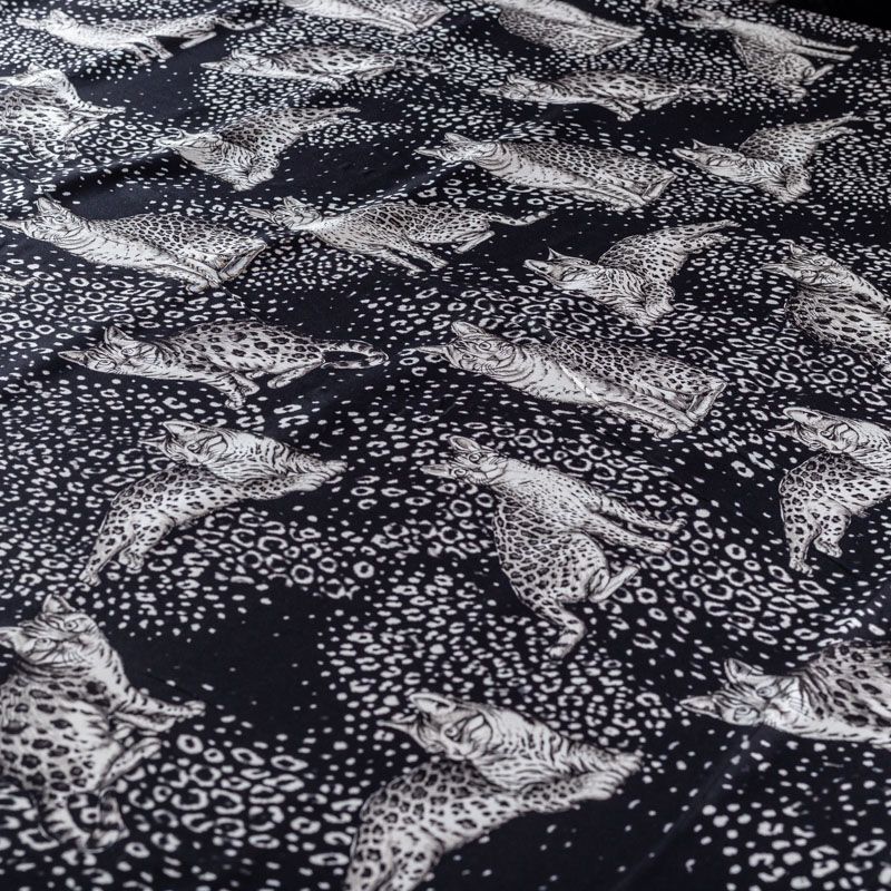 Итальянский матовый шелк черного цвета с узнаваемым принтом диких кошек от известного бренда. Ткань тонкая, не просвечивается, отлично драпируется, легкая и струящаяся, тянется за счет эластана в составе, лицевая сторона креповая, изнанка - атласная. Идеально подойдет для пошива платьев и сарафанов расклешенных моделей, с воланами, рюшами, летящих юбок, топов, блузки, рубашки, костюма в пижамном стиле.