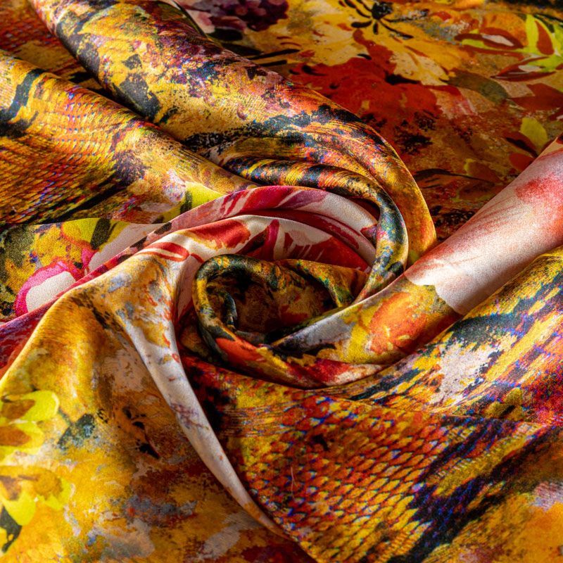 Итальянский натуральный шелк с атласной поверхностью, легкий, струящийся, хорошо драпируется, тянется за счет эластана в составе. Сочетание актуальных в текущем сезоне цветочного и анималистического принтов в насыщенных оттенках будет уместно для пошива летнего сарафана, платья, блузки, костюма в пижамном стиле, широких брюк или юбки.