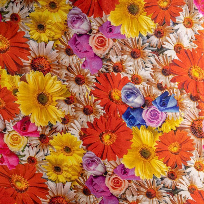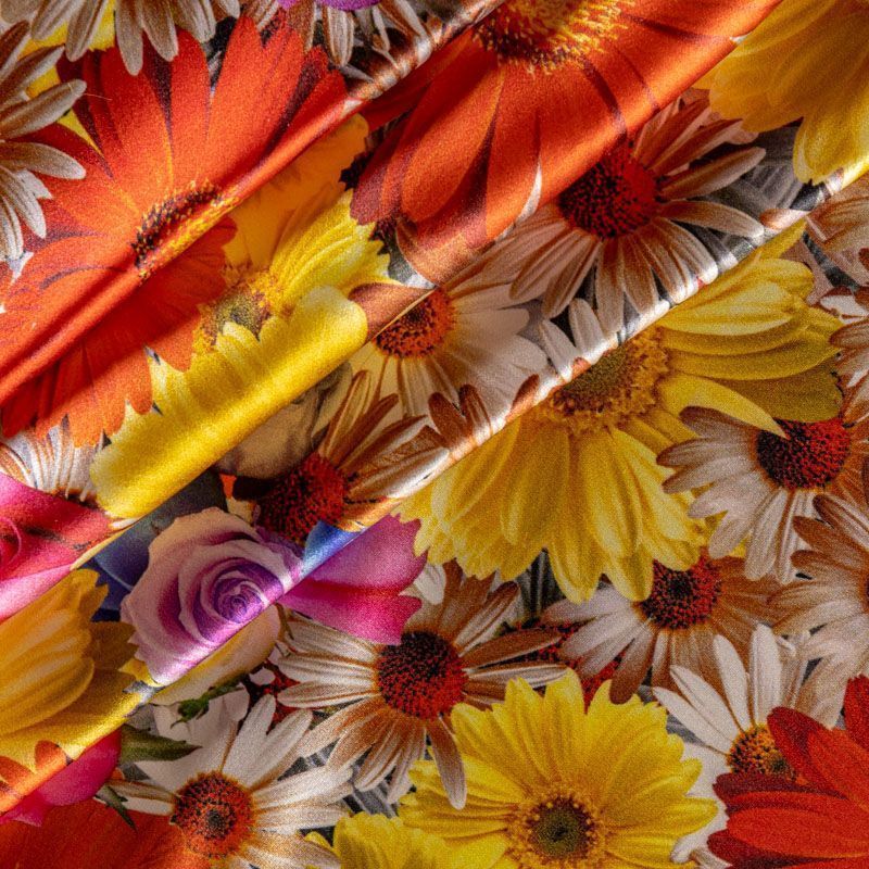 Итальянский шелк с летним ярким цветочным принтом на белом фоне, тонкий, слегка прозрачный, отлично драпируется, легкий и струящийся с атласной поверхностью. Идеально подойдет для пошива платьев и сарафанов расклешенных моделей, с воланами, рюшами, летящих юбок, топов, блузки, рубашки, костюма в пижамном стиле.