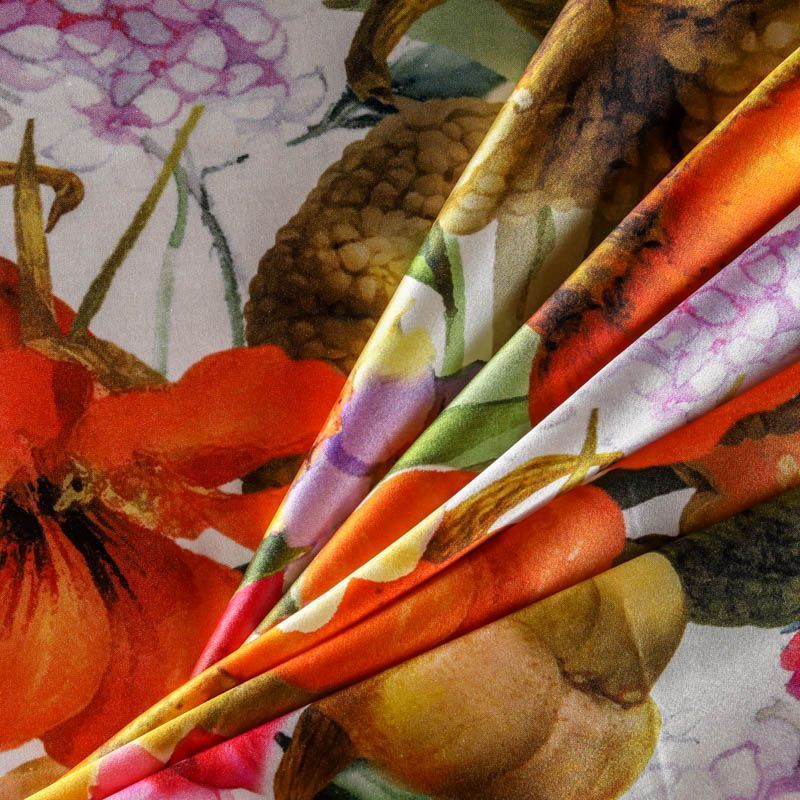 Итальянский атласный шелк с красивым акварельным цветочным принтом. Ткань средней плотности, не просвечивает, струится, хорошо драпируется. Поверхность глядкая, имеет благородный сатиновый блеск. Подойдет для летних платьев и сарафанов, как летящих фасонов, так и скроенных по косой, накидок, юбок, блузок, костюмов, широких брюк, домашней одежды.