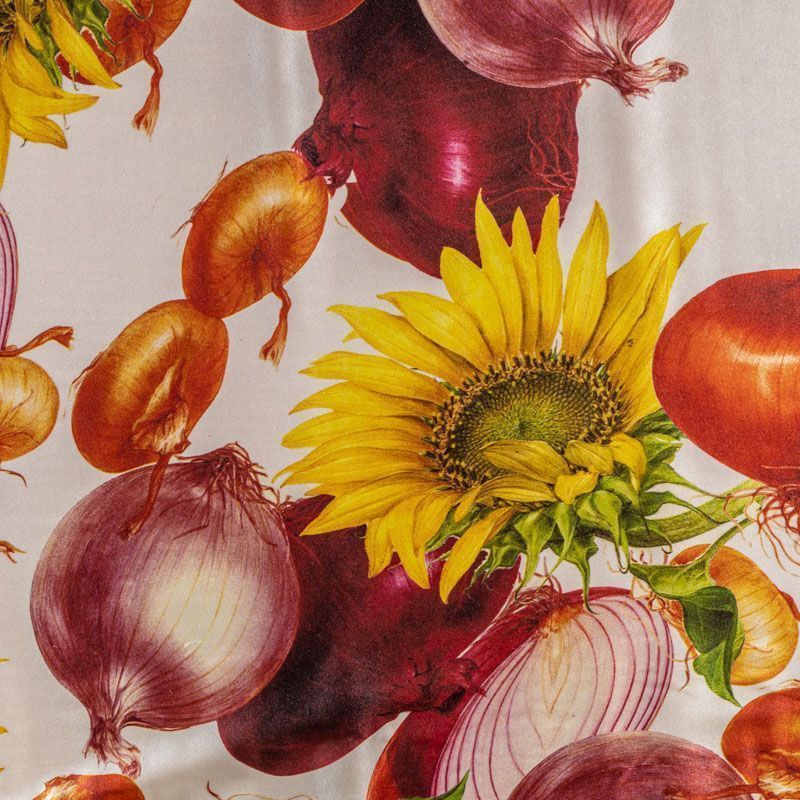 Итальянский атласный шелк с не тривиальным реалистичным растительным принтом. Ткань средней плотности, не просвечивает, струится, хорошо драпируется. Поверхность глядкая, имеет благородный сатиновый блеск. Подойдет смелых образов: летних платьев и сарафанов, как летящих фасонов, так и скроенных по косой, накидок, юбок, блузок, костюмов, широких брюк, домашней одежды.