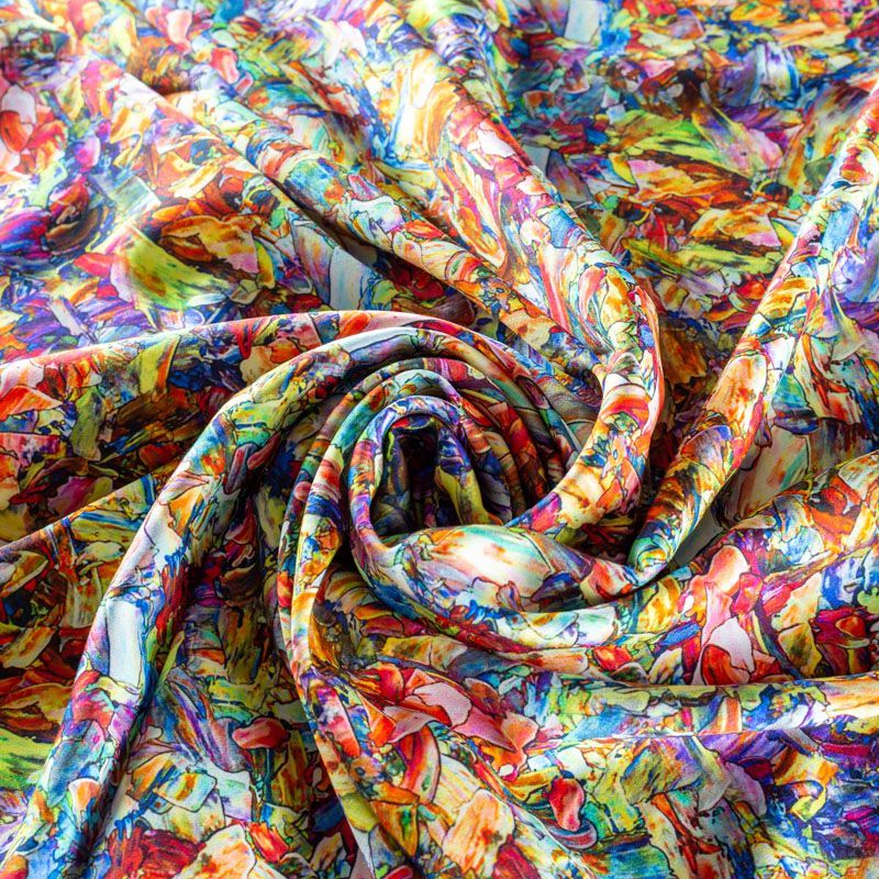 Плательно-блузочный штапель с добавлением шелка с разноцветным абстрактным принтом. Ткань очень мягкая, нежная, пластичная, шелковистая на ощупь, хорошо драпируется, практичная. Особенно актуальна летом, шелк-штапель очень легкий, обволакивающий прохладой. Идеален для пошива летней детской одежды, сарафанов, платьев, юбок, блузок, домашней одежды: халатов, ночной пижамы.
