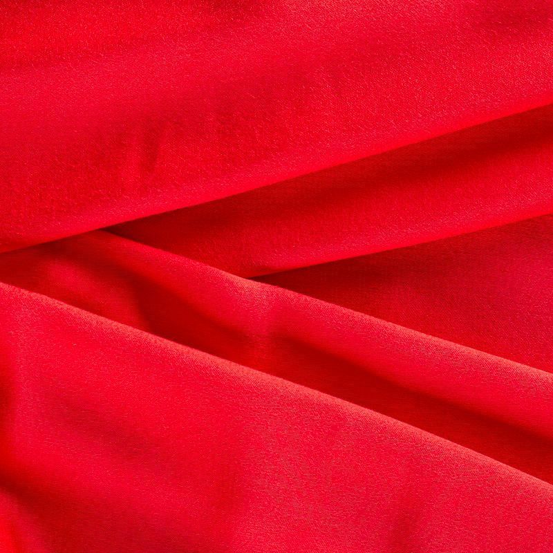 Плательно-блузочный штапель с добавлением шелка красного оттенка. Мягкий, нежный, пластичный, шелковистый на ощупь, хорошо драпируется, тянется за счет эластана в составе. Особенно актуален летом, он очень легкий, обволакивающий прохладой. Идеален для пошива летней детской одежды, сарафанов, платьев, юбок, блузок, домашней одежды: халатов, ночной пижамы.