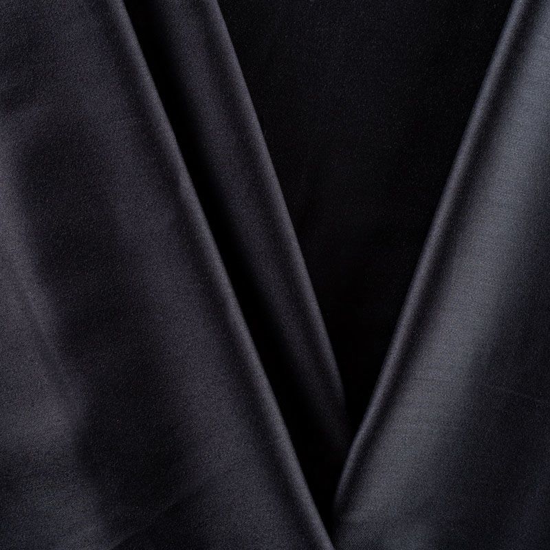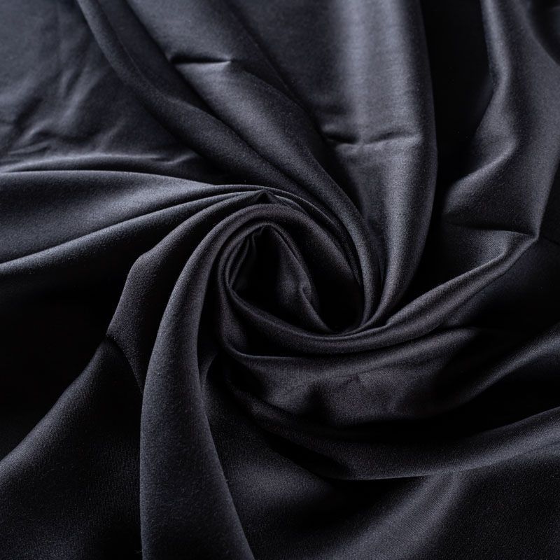 Плательно-блузочный штапель с добавлением шелка черного оттенка. Мягкий, нежный, пластичный, шелковистый на ощупь, хорошо драпируется, тянется за счет эластана в составе. Особенно актуален летом, он очень легкий, обволакивающий прохладой. Идеален для пошива летней детской одежды, сарафанов, платьев, юбок, блузок, домашней одежды: халатов, ночной пижамы.