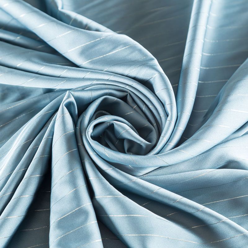 Тонкая, легкая, струящаяся ткань, декорированная тонкими вертикальными полосками люресовой нити, не просвечивает, очень нежная и прятная к телу, обладает благородным атласным блеском, хорошо драпируется, тянется за счет эластана в составе. Идеально подойдет для пошива блузок, платьев и юбок, а также топов, платков, домашней одежды.