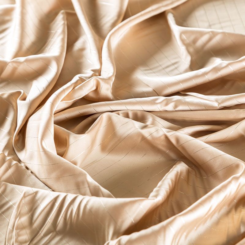Тонкая, легкая, струящаяся ткань, декорированная тонкими вертикальными полосками люресовой нити, не просвечивает, очень нежная и прятная к телу, обладает благородным атласным блеском, хорошо драпируется, тянется за счет эластана в составе. Идеально подойдет для пошива блузок, платьев и юбок, а также топов, платков, домашней одежды.
