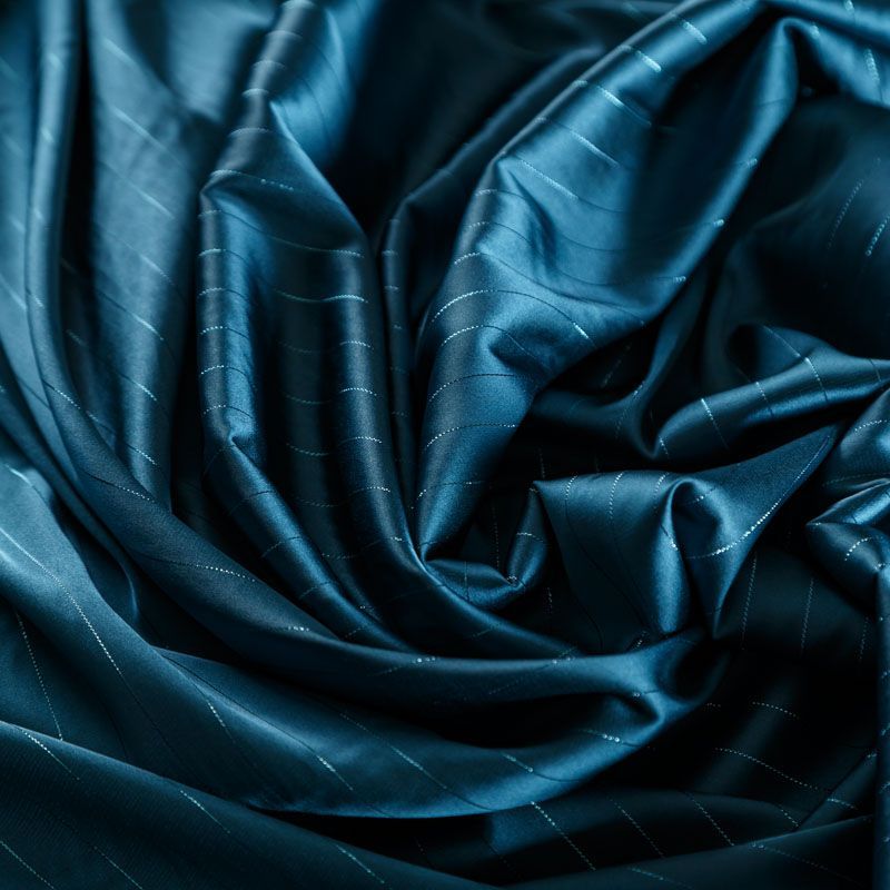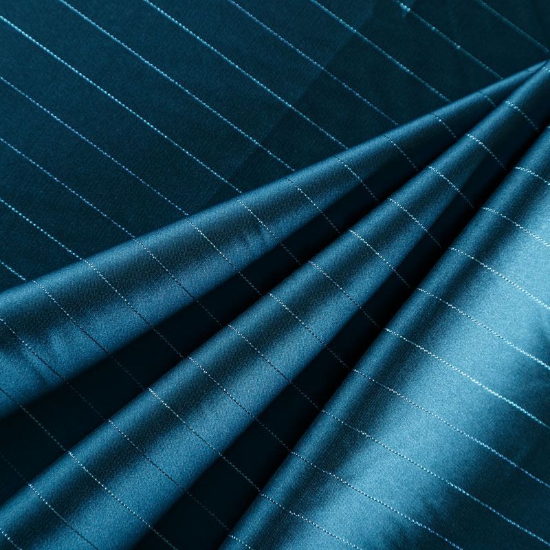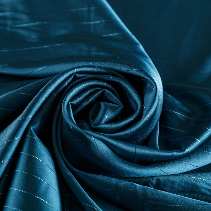 Тонкая, легкая, струящаяся ткань, декорированная тонкими вертикальными полосками люресовой нити, не просвечивает, очень нежная и прятная к телу, обладает благородным атласным блеском, хорошо драпируется, тянется за счет эластана в составе. Идеально подойдет для пошива блузок, платьев и юбок, а также топов, платков, домашней одежды.