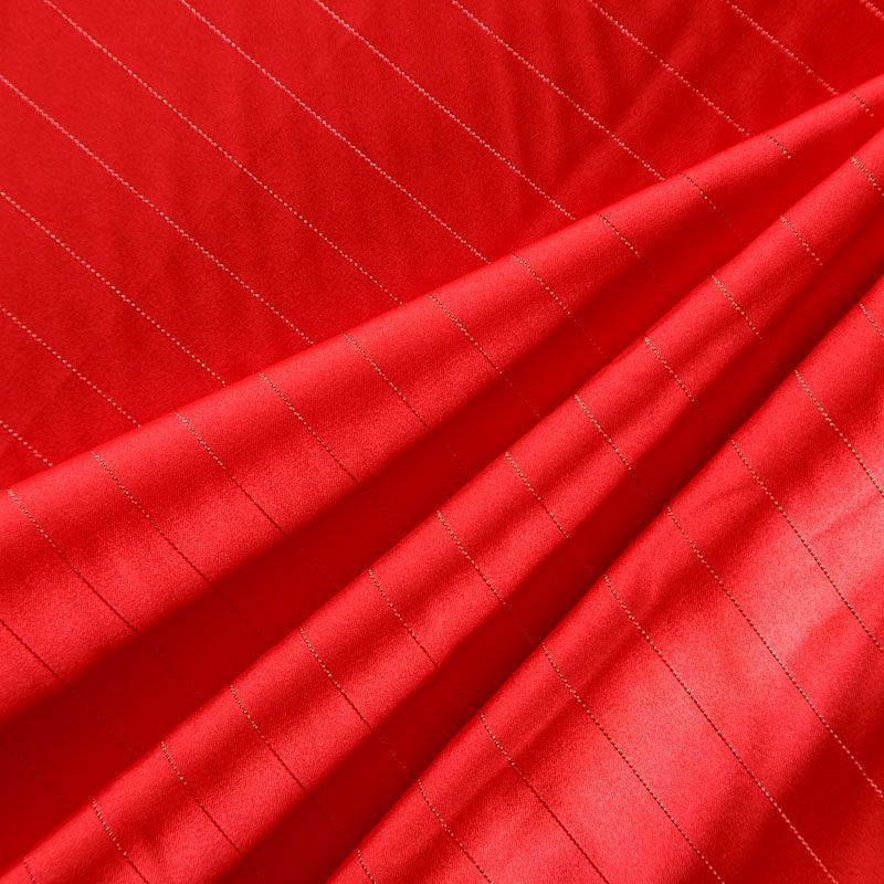 Тонкая, легкая, струящаяся ткань, декорированная тонкими вертикальными полосками люресовой нити, не просвечивает, очень нежная и прятная к телу, обладает благородным атласным блеском, хорошо драпируется, тянется за счет эластана в составе. Идеально подойдет для пошива блузок, платьев и юбок, а также топов, платков, домашней одежды.