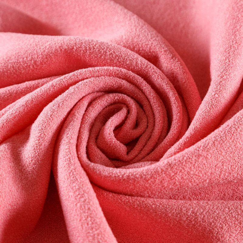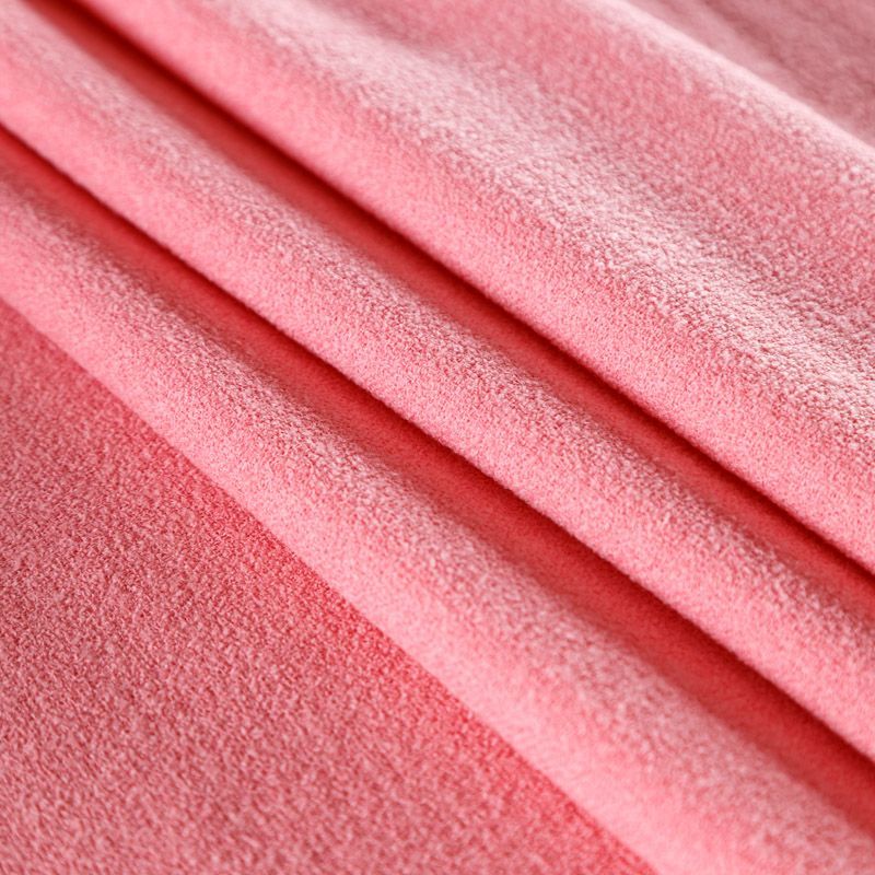 Итальянский шерстяной фактурный креп в розовом оттенке. Ткань хорошо держит форму, приятная на ощупь, гибкая, средней толщины, средней плотности. Подойдет для пошива теплого костюма, юбки, облегченного пальто, куртки, жакета, парки, кейпа, жакета или пончо.