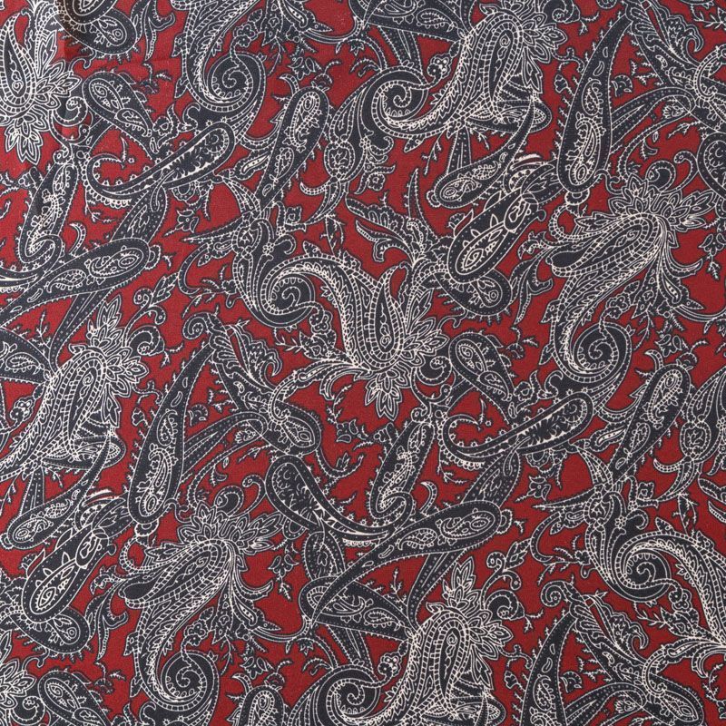 Шифон бордового оттенка с черно-белым принтом пейсли. Струящийся, летящий, воздушный, полупрозрачный. На ощупь мягкий и приятный. Подойдет для пошива тончайших воздушных блуз, изумительных платьев со сборками и воланами и элегантных шарфов.