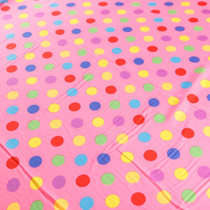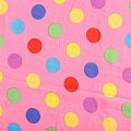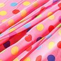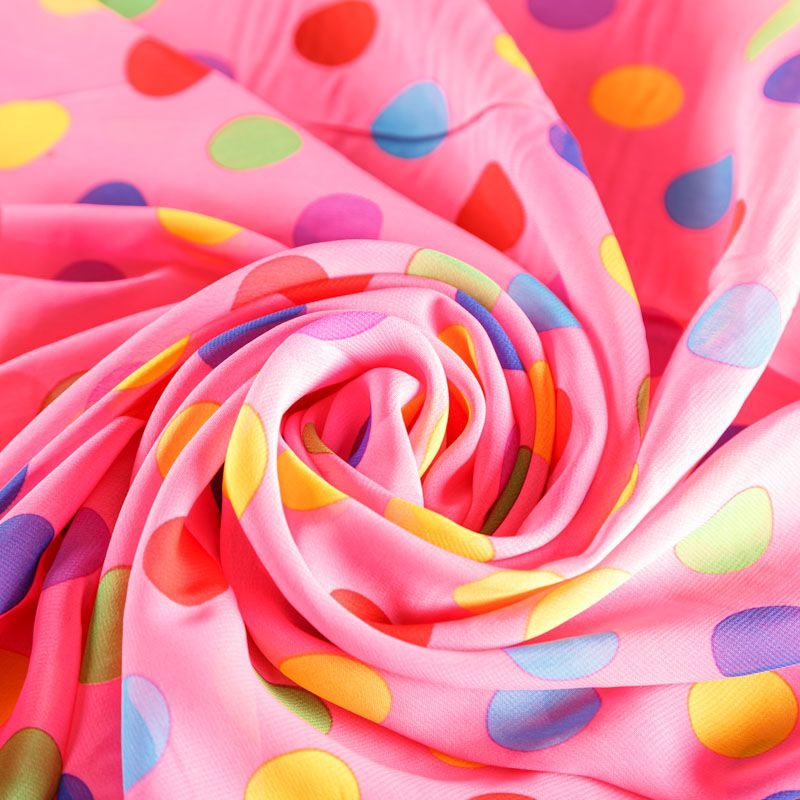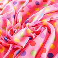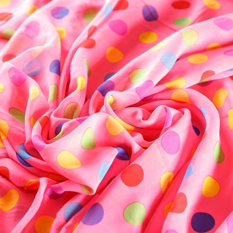 Шифон в ярко-розовом оттенке с разноцветными горохами. Струящийся, летящий, воздушный, полупрозрачный. На ощупь мягкий и приятный.Подойдет для пошива тончайших воздушных блуз, изумительных платьев со сборками и воланами и элегантных шарфов.