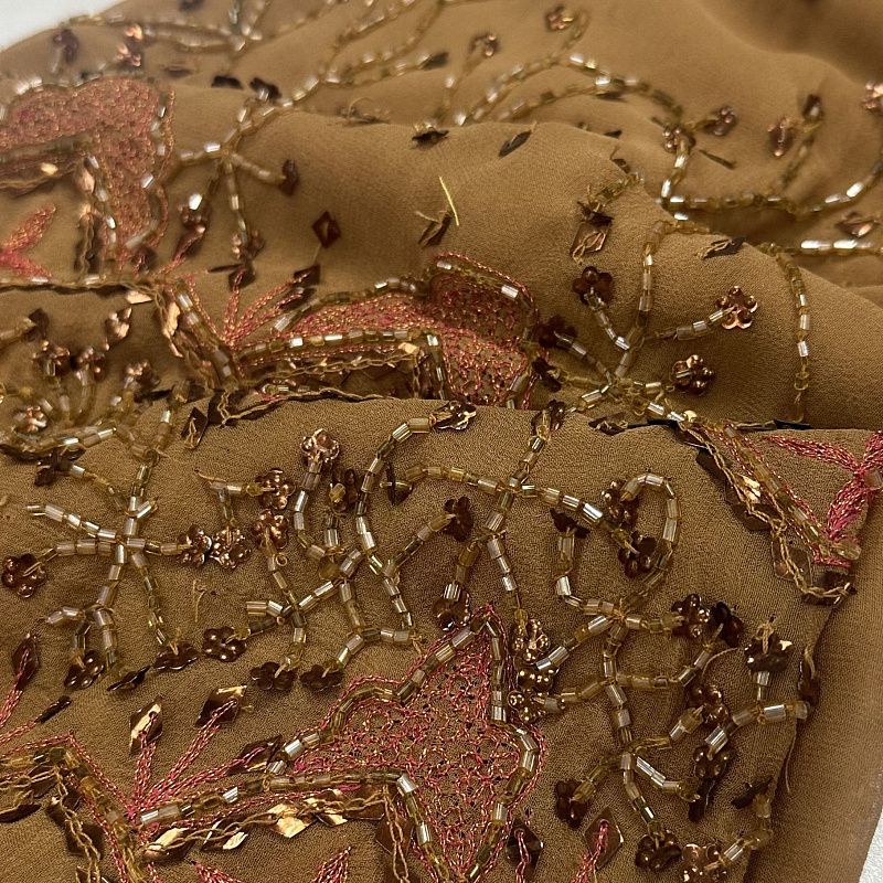 Шифон шелковый с вышивкой 068-20795 карамельный ОСТАТОК 1,3 метра