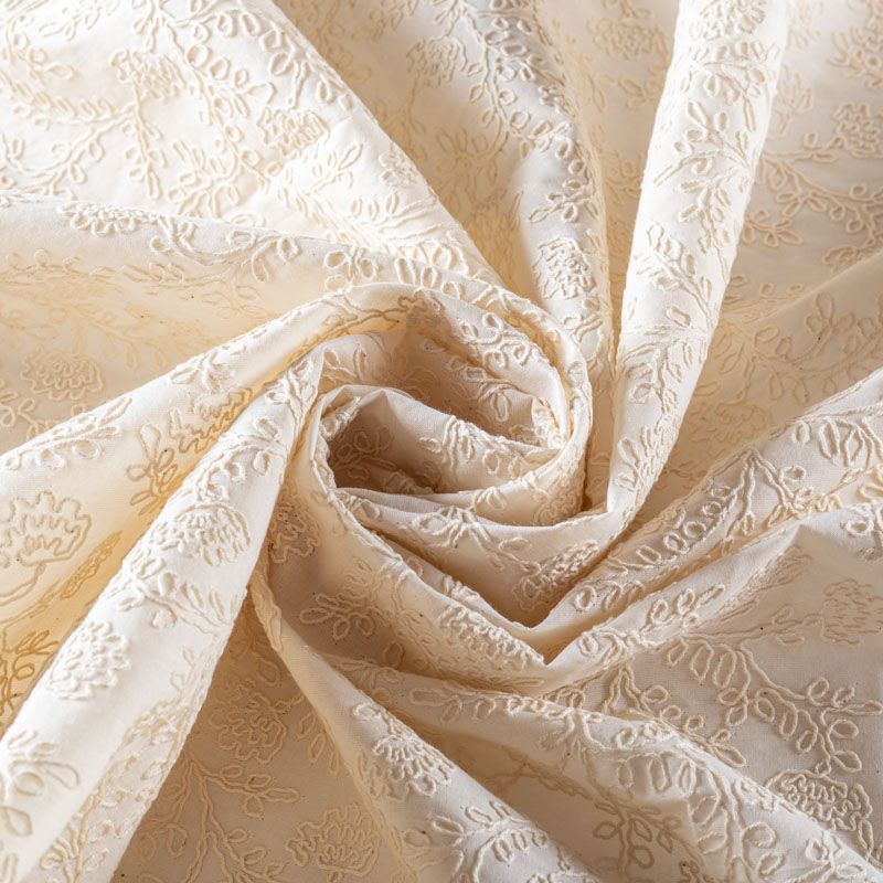 Тренд и мастхэв этого лета - итальянская вышивка на хлопковой основе. На фоне экрю плотная густая вышивка растительного тотива расположена по всему полотну. Ткань средней плотности, хорошо держит форму, приятная на ощупь, почти не просвечивает. Идеально подойдет для пошива рубашки, блузы, топа в воланами, туники, платья, сарафана, юбки.