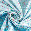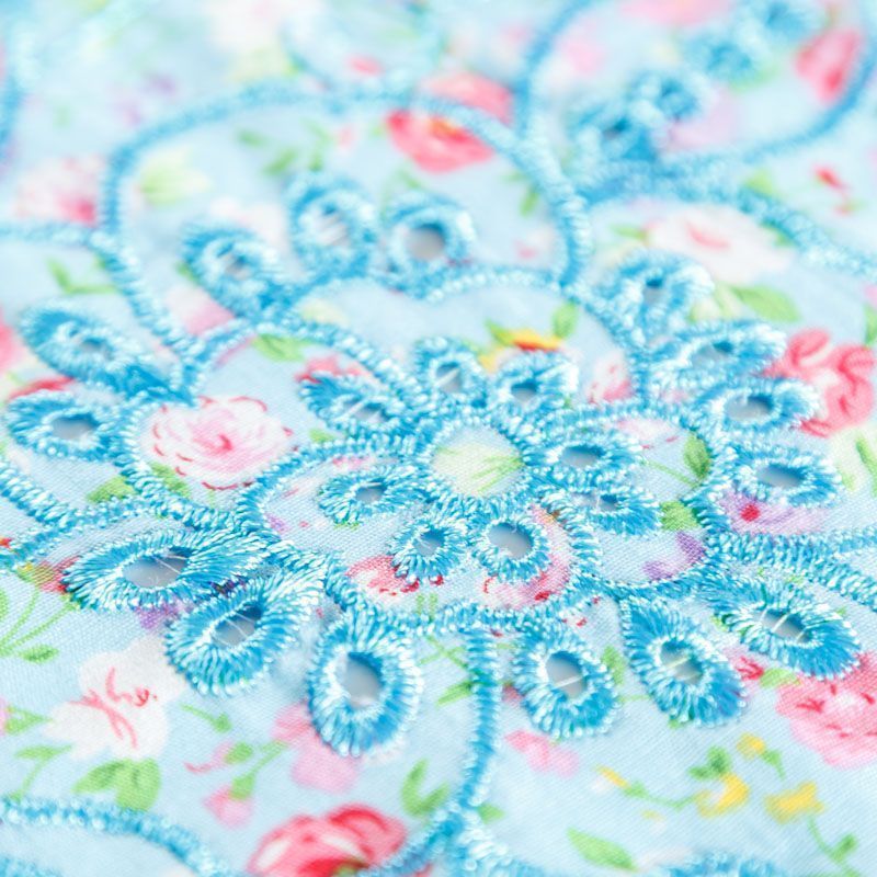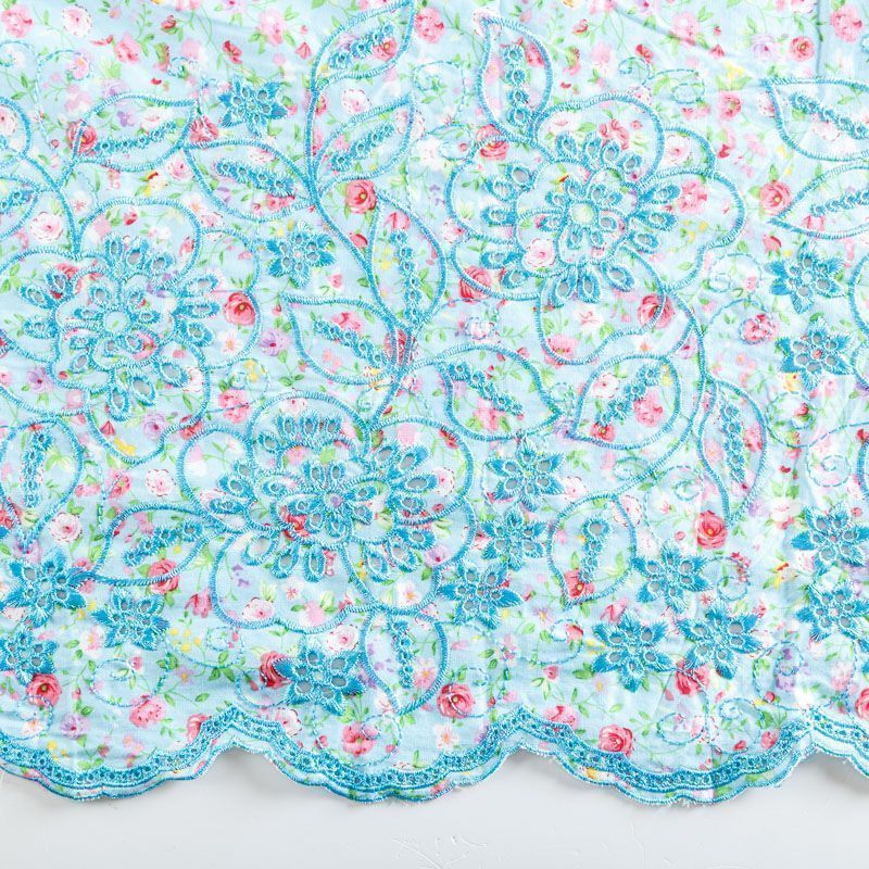 Мягкий и нежный хлопок голубого оттенка с мелким романтичным цветочным принтом украшен изящной вышивкой и перфорацией. Узор выполнен путём машинной вышивки нитками в цвет ткани и расположен вдоль одной кромки, поэтому набирается на изделие объемом. Ткань тонкая, легкая, не сухая, имеет тенденцию к сминаемости, не много просвечивает, не тянется, приятная на ощупь. Идеально подходит для создания летних платьев, сарафанов, юбок, блузок, топов, шорт.