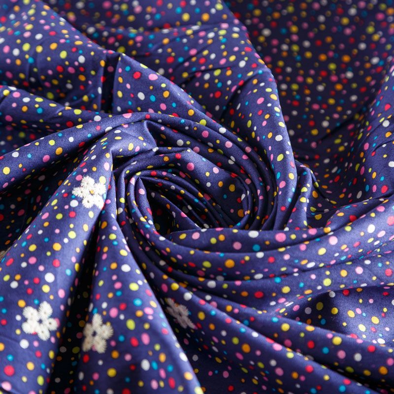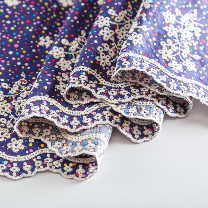 Мягкий и нежный хлопок синего цвета с мелким цветным принтом принтом украшен контрастной вышивкой. Узор выполнен путём машинной вышивки и расположен вдоль одной кромки, образуя фестон, поэтому набирается на изделие объемом. Ткань легкая, не сухая, хорошо драпируется и держит форму, имеет тенденцию к сминаемости, не просвечивает, не тянется, приятная на ощупь. Идеально подходит для создания летних платьев, сарафанов, юбок, блузок, топов, шорт.