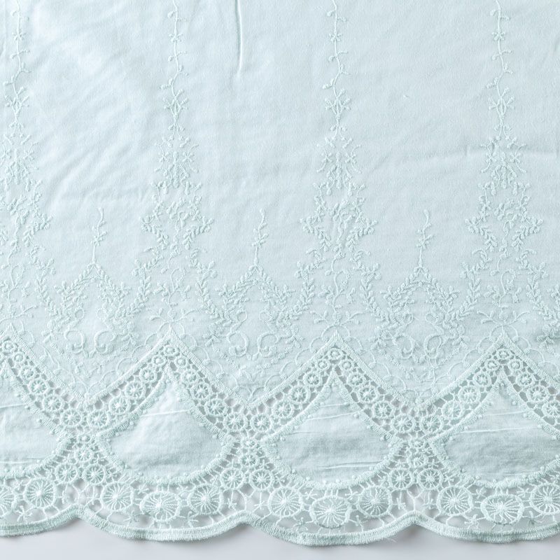 Мягкий и нежный хлопок мятного оттенка с изящной вышивкой. Узор выполнен путём машинной ажурной вышивки "ришелье" нитками в цвет ткани и расположен вдоль кромки. Фактура ткани однородная, имеет тенденцию к сминаемости, просвечивает, не тянется, приятная на ощупь. Идеально подходит для создания летних платьев, сарафанов, юбок, блузок и топов.
