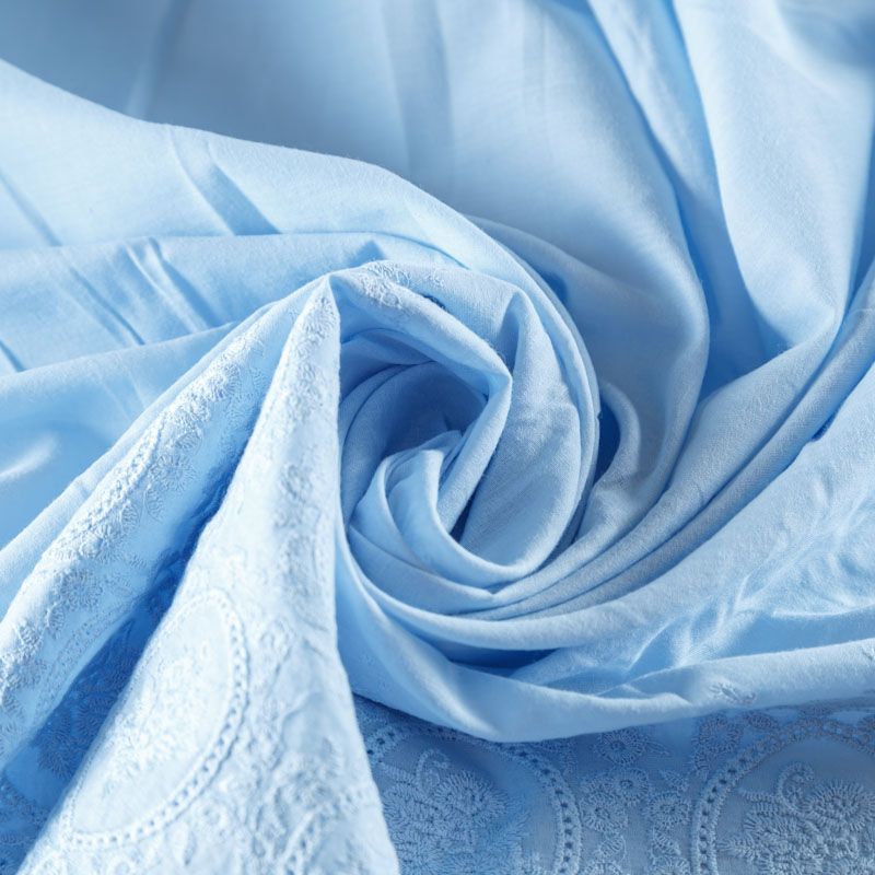 Мягкий и нежный хлопок голубого оттенка с изящной вышивкой. Узор выполнен путём машинной вышивки нитками в цвет ткани и расположен вдоль кромки. Фактура ткани однородная, имеет тенденцию к сминаемости, просвечивает, не тянется, приятная на ощупь. Идеально подходит для создания летних платьев, сарафанов, юбок, блузок и топов.
