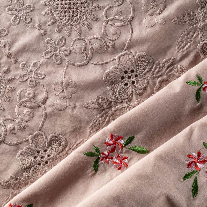 Мягкий хлопок сложного цвета с яркой цветочной вышивкой. Фактура ткани гладкая, имеет тенденцию к сминаемости, немного просвечивает, не тянется, приятная на ощупь. Хлопок прекрасно пропускает воздух, идеально подходит для создания летних платьев, сарафанов, юбок, блузок и топов. Ткань идет купоном (каймой) вдоль одной кромки. Купон выполнен путём машинной вышивки нитками в цвет ткани. Набирается объемом.