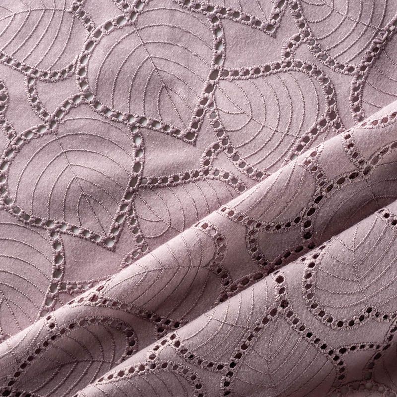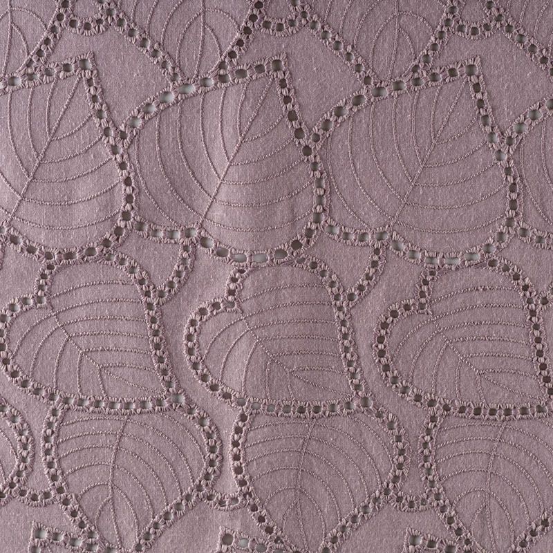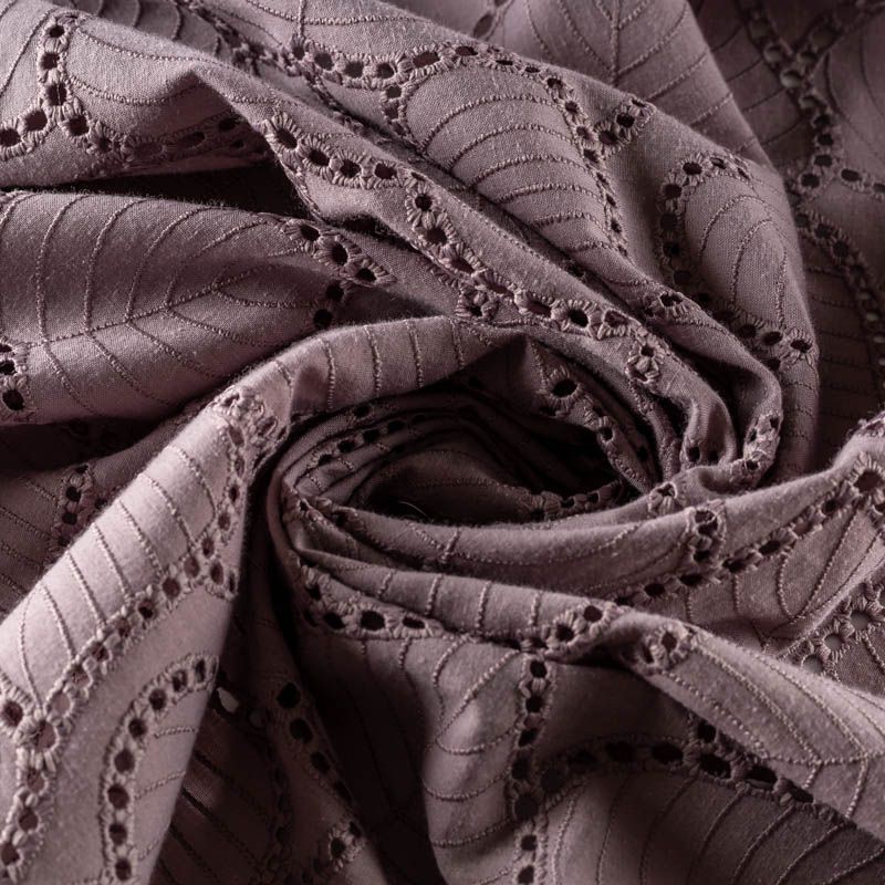 Мягкая ткань ришелье с листиками лилового оттенка. Фактура ткани обладает небольшой рельефностью, имеет тенденцию к сминаемости, немного просвечивает, не тянется, приятная на ощупь. Прекрасно пропускает воздух, идеально подходит для создания летних платьев, сарафанов, юбок, блузок и топов. Края ткани вдоль кромки фигурные. Набирается объемом.