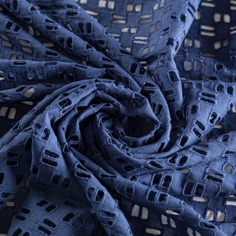 Мягкий и нежный хлопок фиолетово-синего оттенка с геометрической вышивкой и перфорацией. Узор выполнен путём машинной вышивки нитками в цвет ткани и расположен по всему полотну. Фактура ткани однородная, имеет тенденцию к сминаемости, не тянется, приятная на ощупь. Может потребоваться подклад. Идеально подходит для создания летних платьев, сарафанов, юбок, блузок и топов.