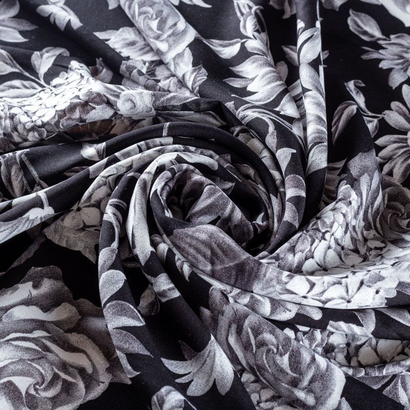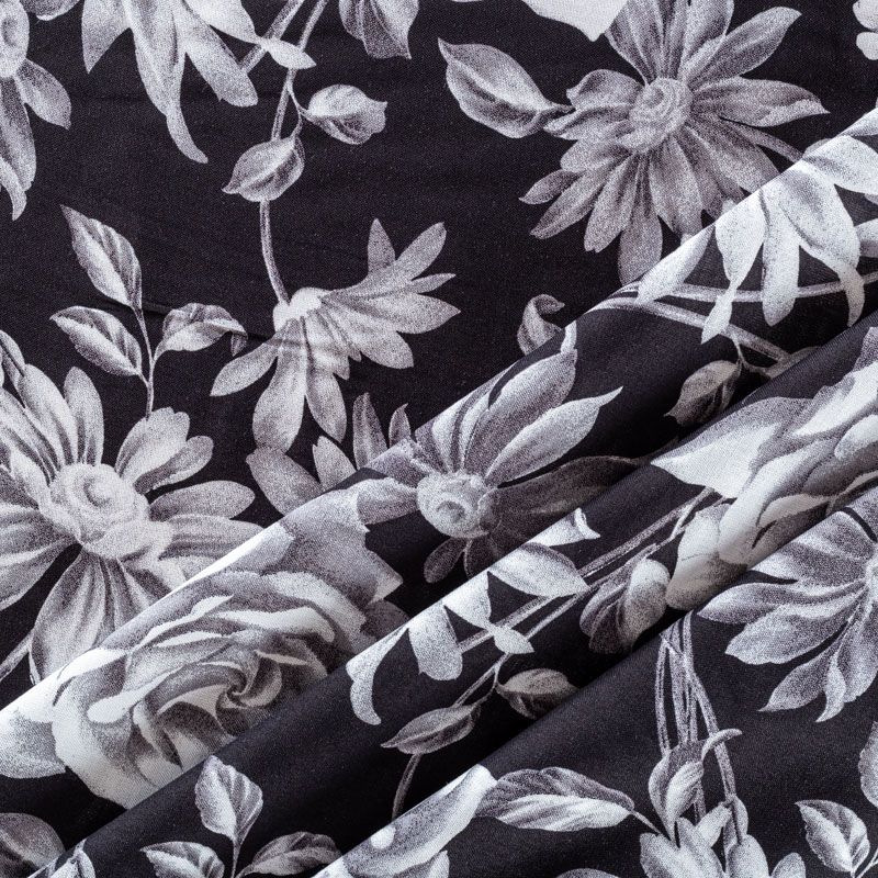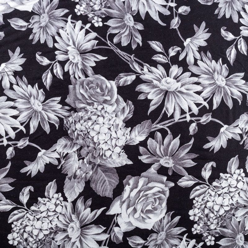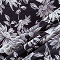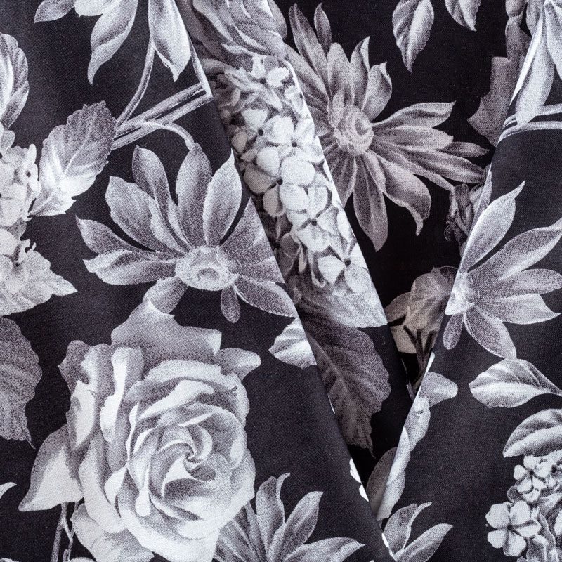 Плательно-блузочный штапель с реалистичным монохромным цветочным принтом на черном фоне. Мягкий, тонкий, нежный, пластичный, приятный на ощупь, хорошо драпируется, практичный. Подойдет для пошива платья, топа, блузки, рубашки, юбки, летних брюк.