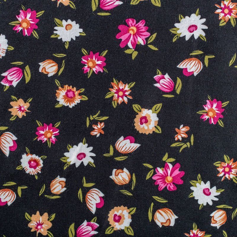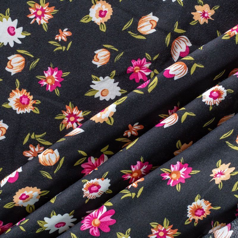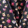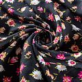 Плательно-блузочный штапель с цветочным принтом на черном фоне. Мягкий, тонкий, нежный, пластичный, приятный на ощупь, хорошо драпируется, практичный. Подойдет для пошива платья, топа, блузки, рубашки, юбки, летних брюк.