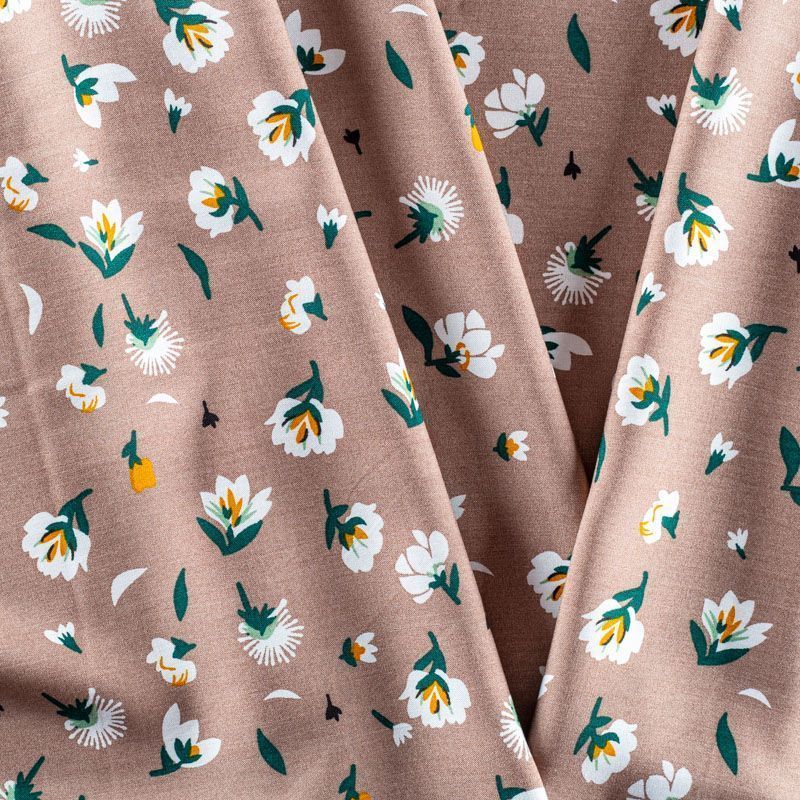 Плательно-блузочный штапель с цветочным принтом на пепельно-коричневом фоне. Мягкий, тонкий, нежный, пластичный, приятный на ощупь, хорошо драпируется, практичный. Подойдет для пошива платья, топа, блузки, рубашки, юбки, летних брюк.