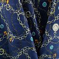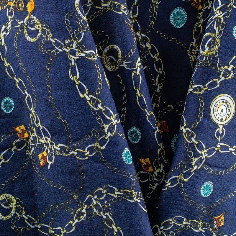 Плательно-блузочный штапель синего оттенка с многочисленными золотыми цепями, часами и украшениями. Ткань мягкая, тонкая, нежная, пластичная, приятная на ощупь, хорошо драпируется, практичная, поверхность слегка фактурная. Подойдет для пошива платья, топа, блузки, рубашки, юбки, летних брюк.