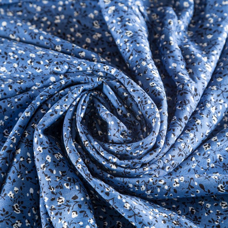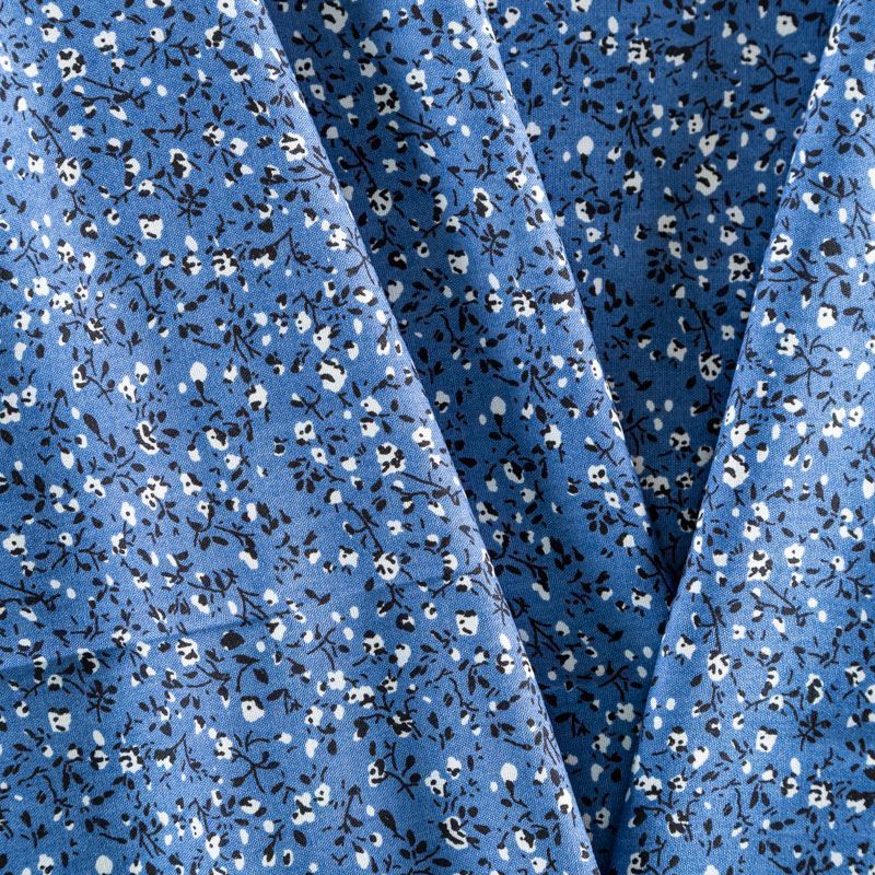 Плательно-блузочный штапель с мелким растительным принтом на сине-голубом фоне. Мягкий, тонкий, нежный, пластичный, приятный на ощупь, хорошо драпируется, практичный. Подойдет для пошива платья, топа, блузки, рубашки, юбки, летних брюк, комбинезона.