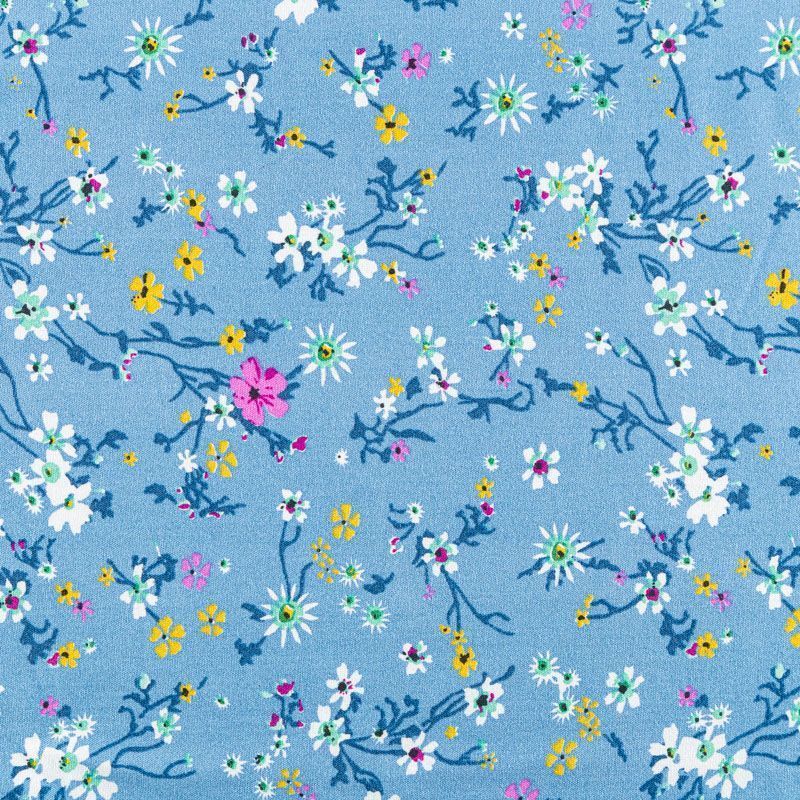 Плательно-блузочный штапель с мелким растительным принтом на сине-голубом фоне. Мягкий, тонкий, нежный, пластичный, приятный на ощупь, хорошо драпируется, практичный. Подойдет для пошива платья, топа, блузки, рубашки, юбки, летних брюк, комбинезона.
