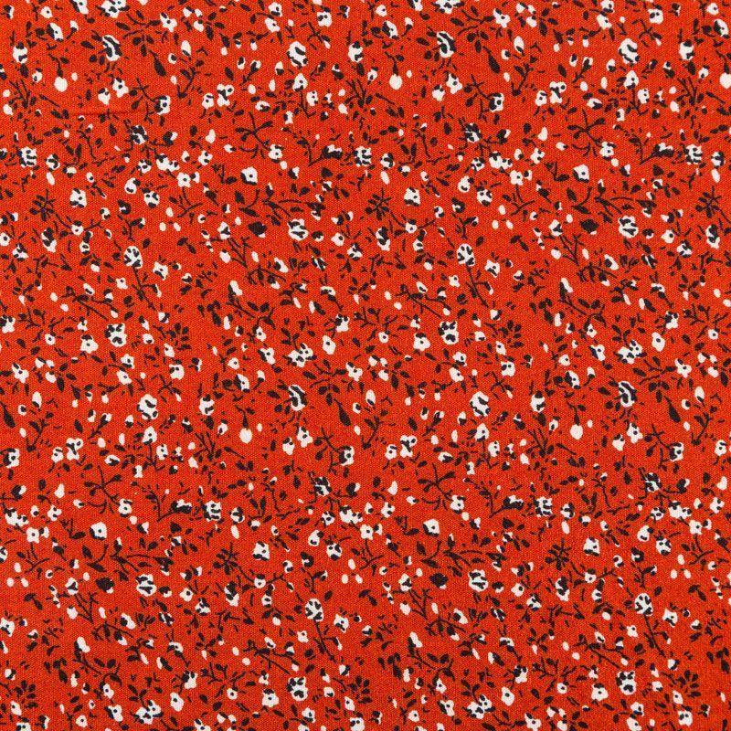 Плательно-блузочный штапель с мелким растительным принтом на темном апельсиновом фоне. Мягкий, тонкий, нежный, пластичный, приятный на ощупь, хорошо драпируется, практичный. Подойдет для пошива платья, топа, блузки, рубашки, юбки, летних брюк, комбинезона.