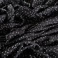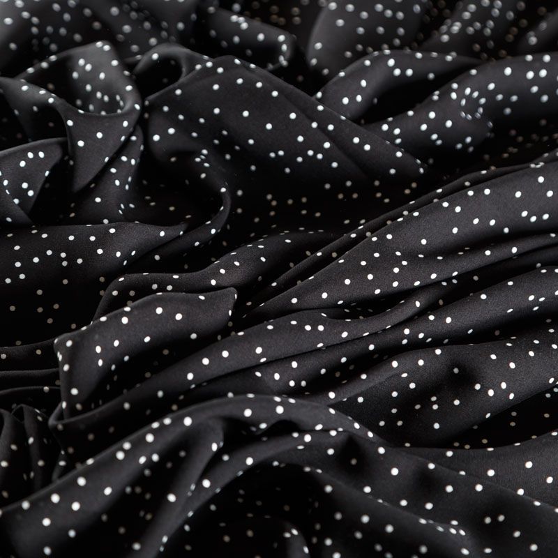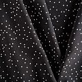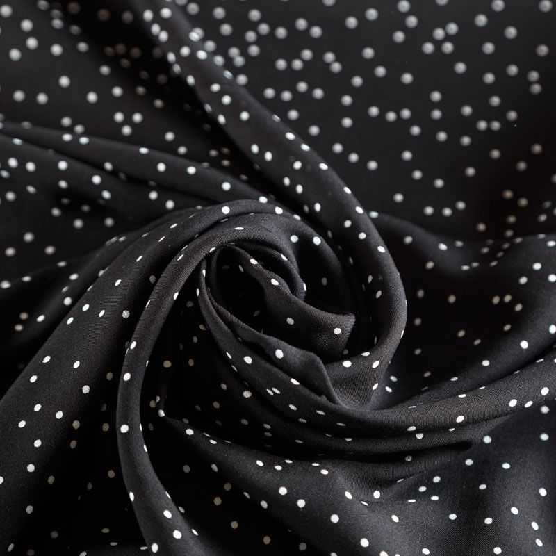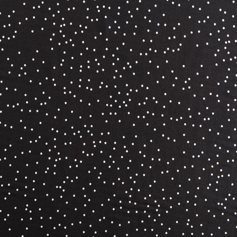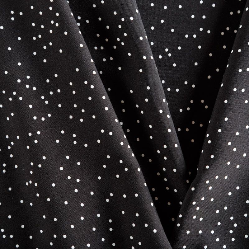 Плательно-блузочный штапель с принтом в мелкий хаотичный горошек на черном фоне. Материал мягкий, тонкий, нежный, пластичный, приятный на ощупь, хорошо драпируется, практичный. Подойдет для пошива платья сарафана, топа, блузки, рубашки, юбки, летних брюк, комбинезона, а также домашней одежды.