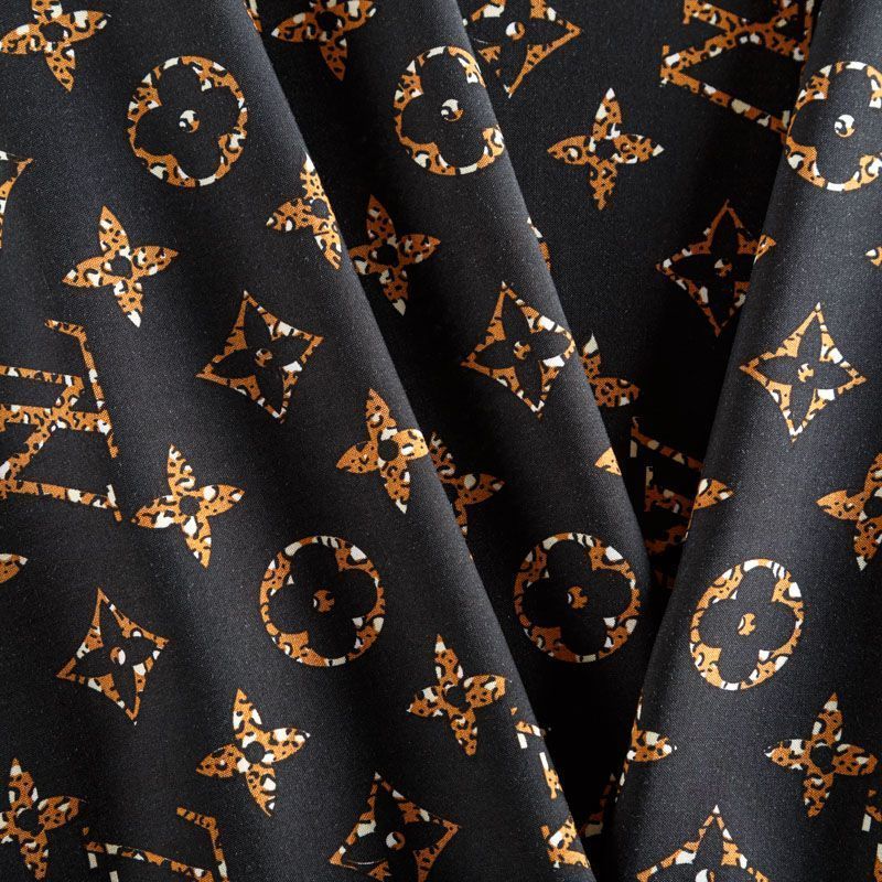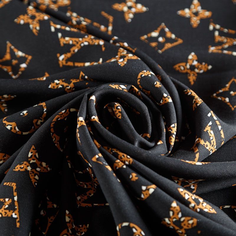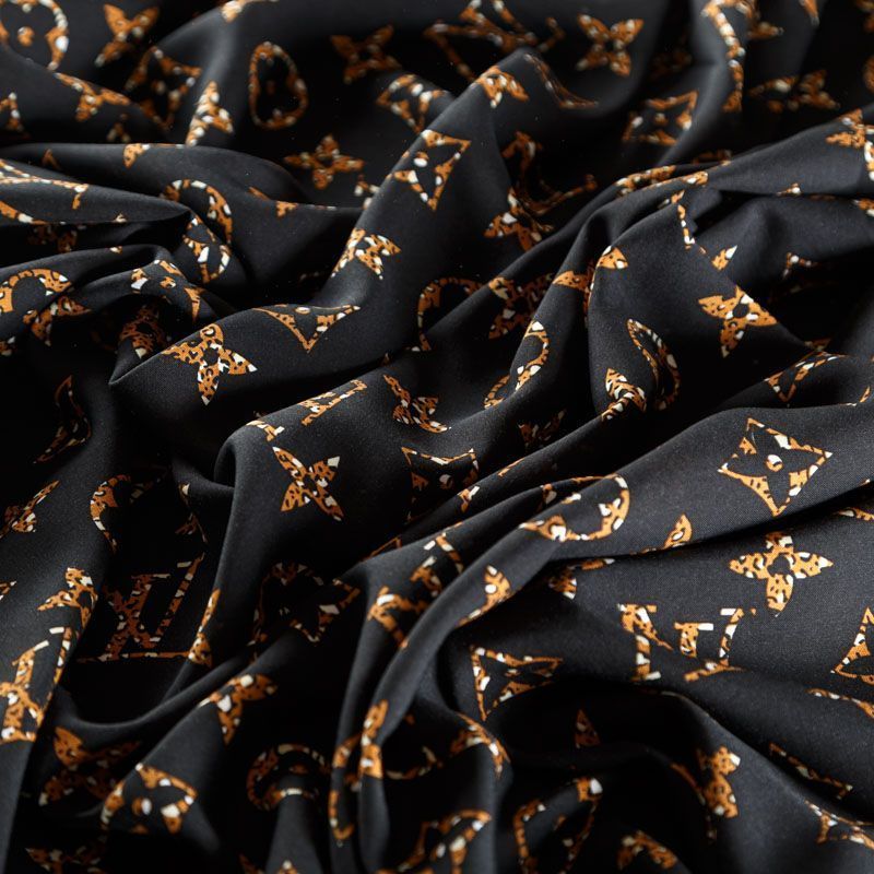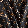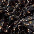 Плательно-блузочный штапель с принтом лого известного бренда в бежево-коричневых тонах на черном фоне. Материал мягкий, тонкий, нежный, пластичный, приятный на ощупь, хорошо драпируется, практичный. Подойдет для пошива платья сарафана, топа, блузки, рубашки, юбки, летних брюк, комбинезона, а также домашней одежды.