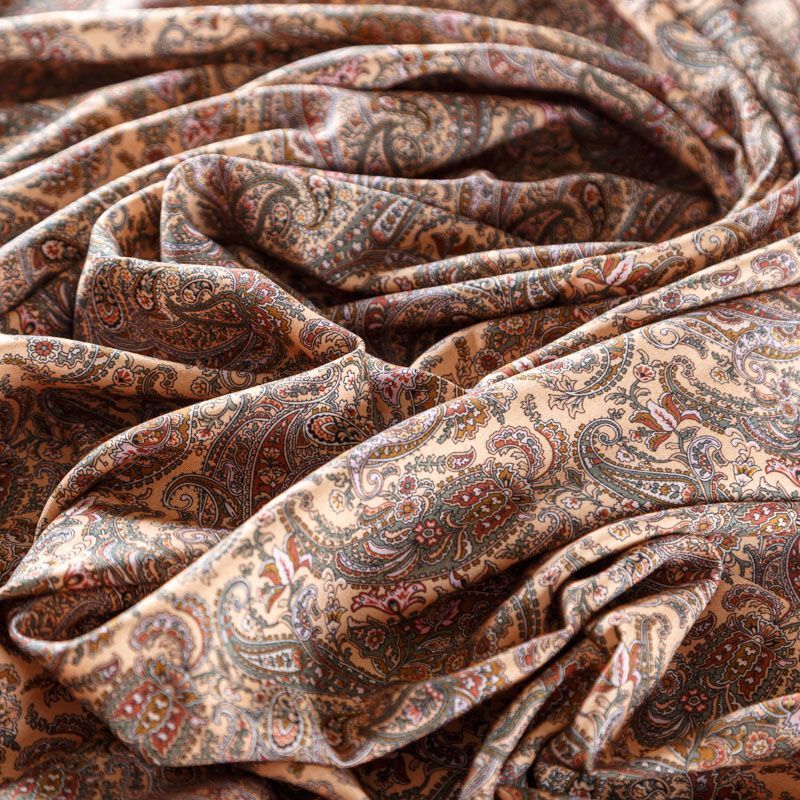 Итальянский плательно-блузочный штапель бежевого оттенка с богатым принтом пейсли. Ткань мягкая, тонкая, нежная и пластичная, приятная на ощупь, хорошо драпируется, практичная. Подойдет для пошива платья, топа, блузки, рубашки, юбки, летних брюк.