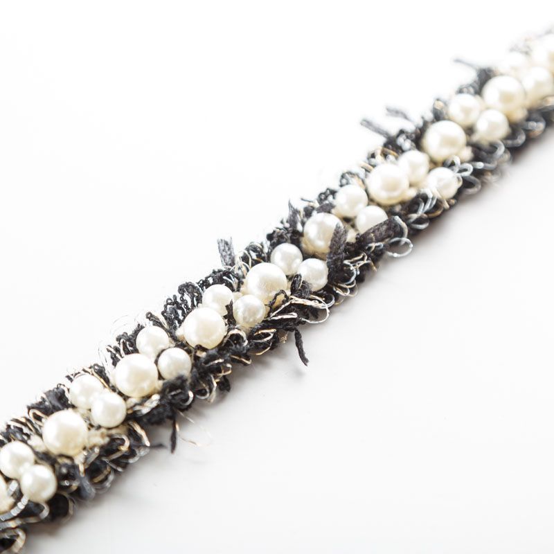 Тесьма декоративная выполнена из бархатистых нитей, прошита люрексом и украшена жемчужными бусинами. Бусины надежно закреплены на тесьме. Подойдет для отделки одежды из твида, букле в стиле Шанель.