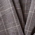 Итальянская костюмная ткань в клетку гленчек, которая образуется жаккардовым переплетением серых, бежевых и черных нитей. Ткань очень мягкая, приятная на ощупь, пластичная, хорошо драпируется. Отлично подойдет на костюмы, юбки, брюки, платья, жакеты.