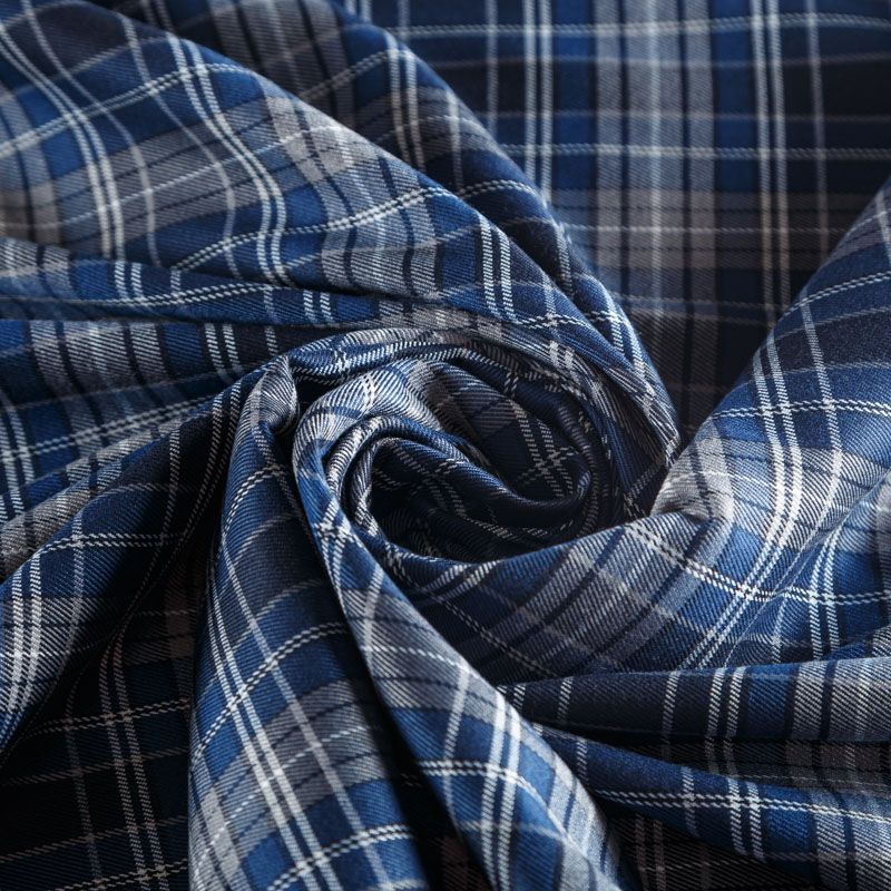 Костюмно-плательная ткань средней плотности в серо-синей гамме. Сочетание линий синего, черного, молочного и серого цветов образуют красивую сложную клетку. Ткань не сухая, пластичная, приятная на ощупь, тянется за счет эластана в составе, формоустойчива, хорошо драпируется. Отлично подойдет для пошива костюмов, юбки, брюк, платья, жакета, сарафана, шорт.