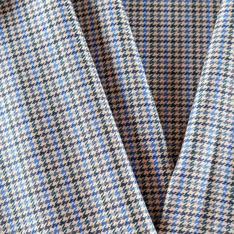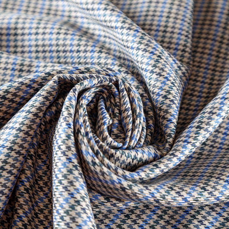 Итальянская костюмно-плательная шерсть средней плотности в актуальном бежевом оттенке с классическим узором гусиная лапка в черно-синиих цветах. Поверхность ткани имеет выраженное диагональное плетение, на ощупь гладкая, полированная благодаря содержанию шерсти ламы. Ткань очень мягкая, теплая, уютная, шерсть не колется, в носке очень комфортная. Подойдет для пошива стильного костюма, мужского пиджака, платья, жакета, юбки, шорт или легкого пальто для осенне-весеннего сезона.
