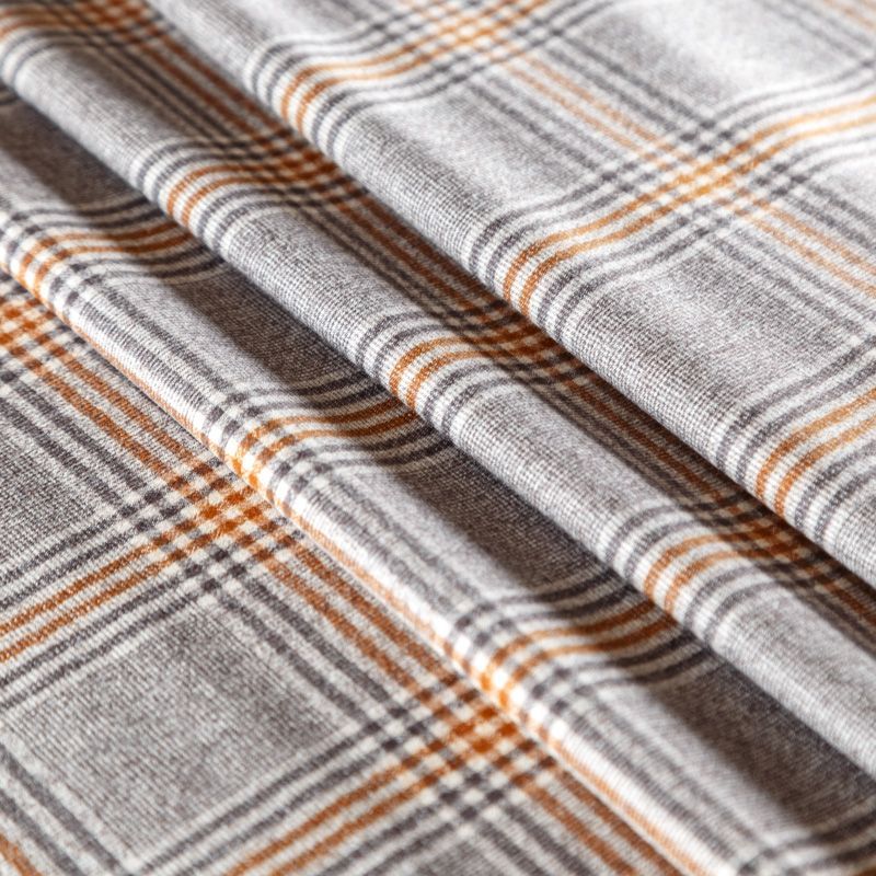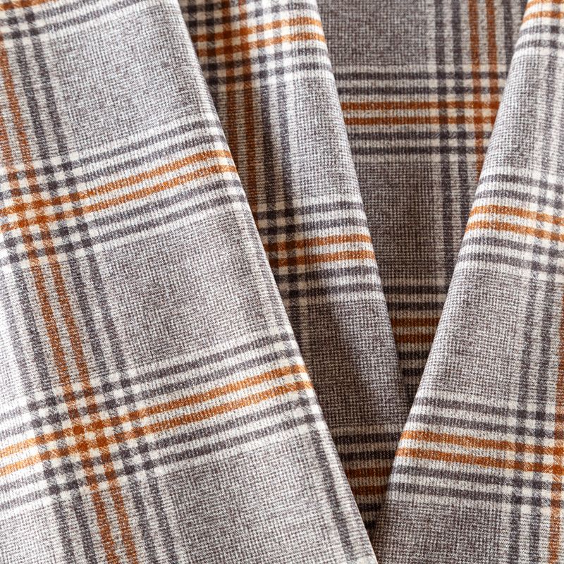 Итальянская костюмно-плательная шерсть в сером оттенке. Сочетание линий молочного, оранжевого и серого цветов образуют красивую сложную клетку. Ткань средней плотности, пластичная, очень приятная на ощупь, драпируется в слегка держащие форму складки, с полотняным переплетением, не тянется. Подойдет для всех видов изделий - платьев, сарафанов, модных жакетов, жилетов, брючных и юбочных костюмов, кюлотов, брюк-палаццо, юбок различных фасонов.