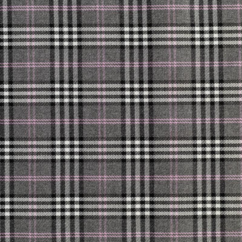 Ткань средней плотности, мягкая и приятная на ощупь, немного тянется, формоустойчива, хорошо драпируется и образует мягкие складки. Сочетание линий черного, белого и розового цветов на спокойном сером фоне образует сложную красивую клетку тартан. Ткань отлично подойдет на костюмы, юбки, брюки, платья, жакеты.
