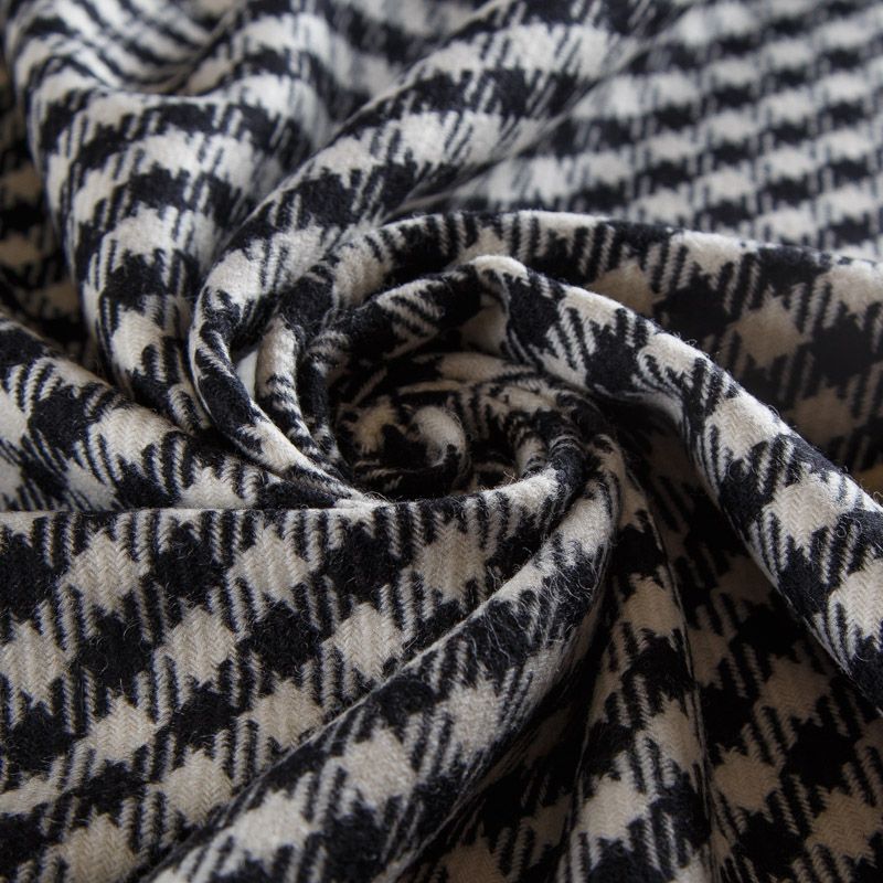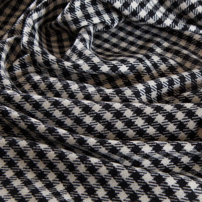 Итальянская костюмно-плательная шерсть средней плотности, не сухая, пластичная, приятная на ощупь, формоустойчива, не мнется, хорошо драпируется. Мелкая клетка образована за счет сочетания полос черного и молочного оттенков. Ткань отлично подойдет на костюм, жилет, жакет, легкое пальто, юбку, брюки, плате, сарафан, шорты.