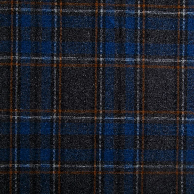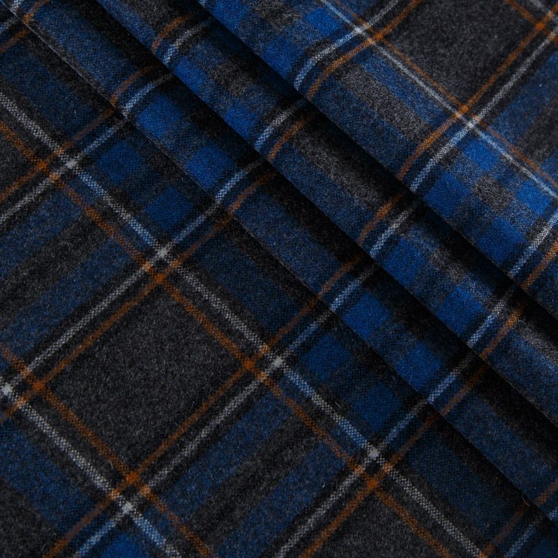 Итальянская костюмно-плательная шерсть средней плотности в графитовом оттенке, сочетание линий синего, белого, оранжевого и серого цветов образуют красивую клетку. Ткань не сухая, пластичная, приятная на ощупь, почти не мнется, хорошо драпируется. Отлично подойдет на костюм, жилет, жакет, юбку, брюки, платье, сарафан, шорты.