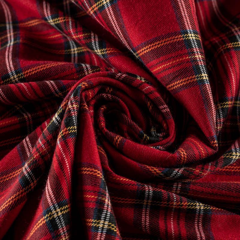Ткань средней плотности, мягкая и приятная на ощупь, немного тянется, формоустойчива, хорошо драпируется и образует мягкие складки. Сочетание линий желтого, черного, синего и белого цветов на ярком красном фоне образует сложную красивую клетку тартан. Ткань отлично подойдет на костюмы, юбки, брюки, платья, жакеты.