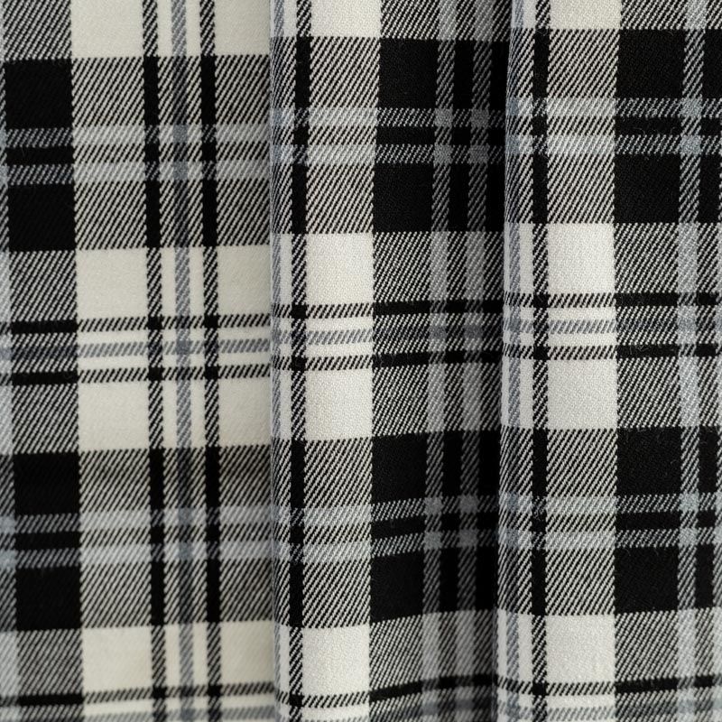 Ткань средней плотности, мягкая и приятная на ощупь, немного тянется, формоустойчива, хорошо драпируется и образует мягкие складки. Сочетание линий серого и черного цветов на белом фоне образует красивую клетку тартан. Ткань отлично подойдет на костюмы, юбки, брюки, платья, жакеты.
